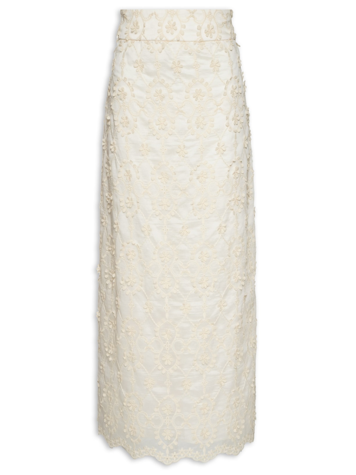 A saia off white é confeccionada em tecido leve sem elasticidade. A peça solta ao corpo, possui cintura alta, cós largo, fenda posterior, bordado figurativo, barra ondulada, comprimento midi, forro e fechamento lateral por zíper metálico.