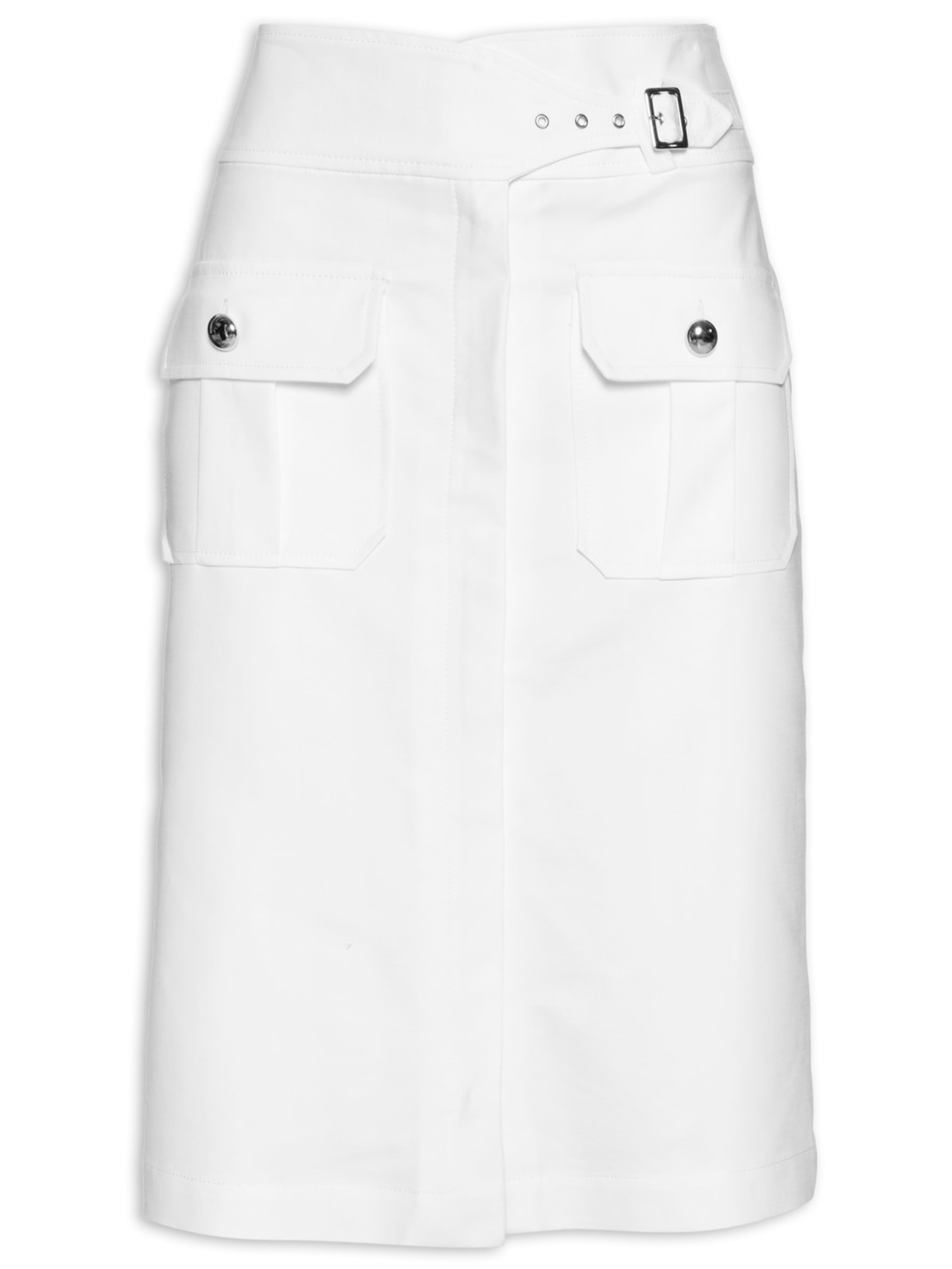 A saia branca é confeccionada por tecido leve com baixa elasticidade. A peça possui cintura alta, cós com passante aplicado na parte frontal, bolsos frontais com pregas e fechamento por abas sobrepostas e botões, comprimento midi e fechamento frontal por zíper e tira com fivela ajustável.