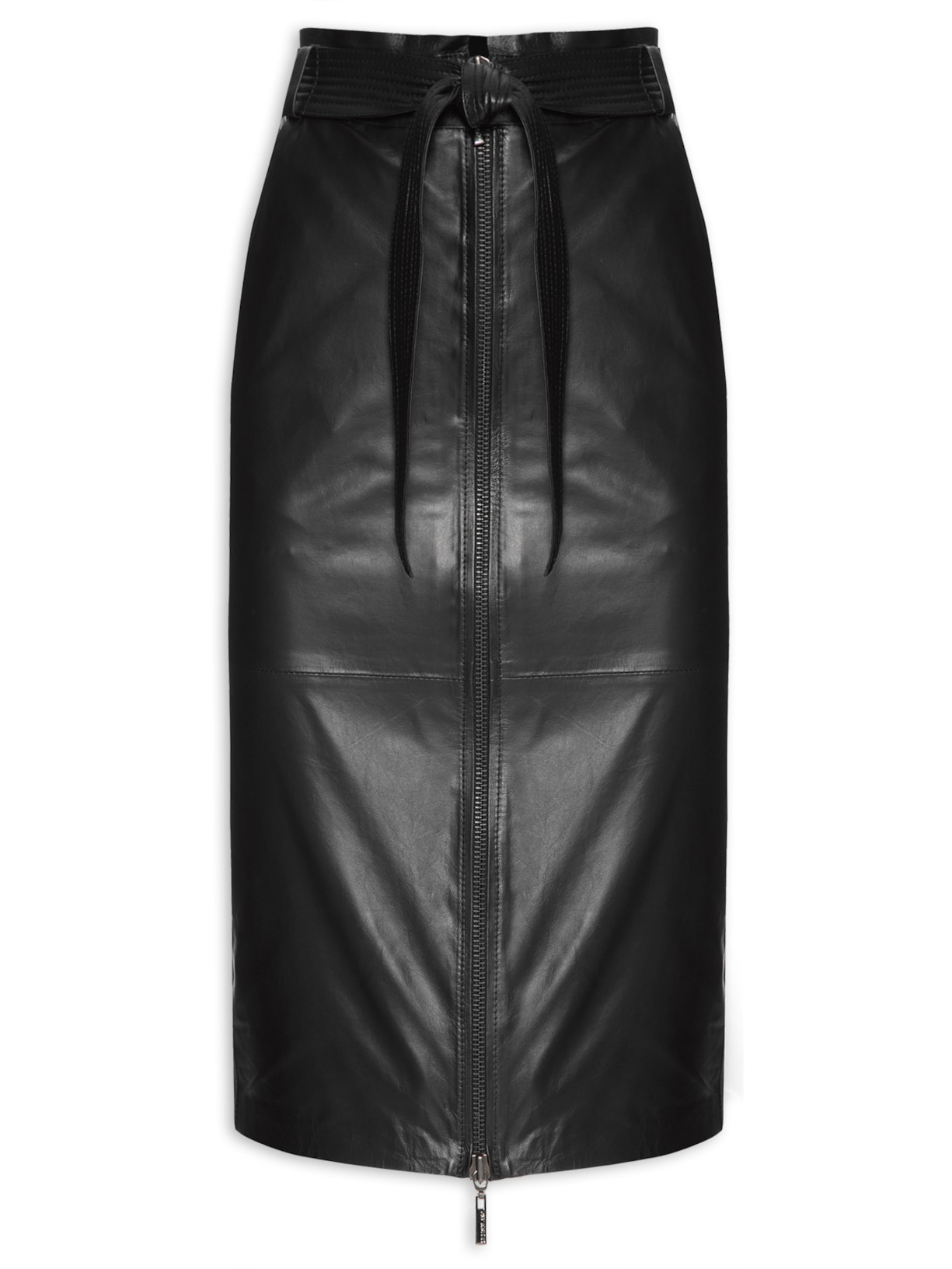 A saia preta é confeccionada em couro sem elasticidade. A peça justa ao corpo possui cintura alta, cós com passantes aplicados, detalhe de aba acima do cós, bolsos frontais de modelo faca, pences posteriores, recortes frontais e posteriores, forro, tira larga alongada com detalhes de pespontos para amarração frontal, comprimento midi e fechamento frontal em zíper com dois puxadores.
