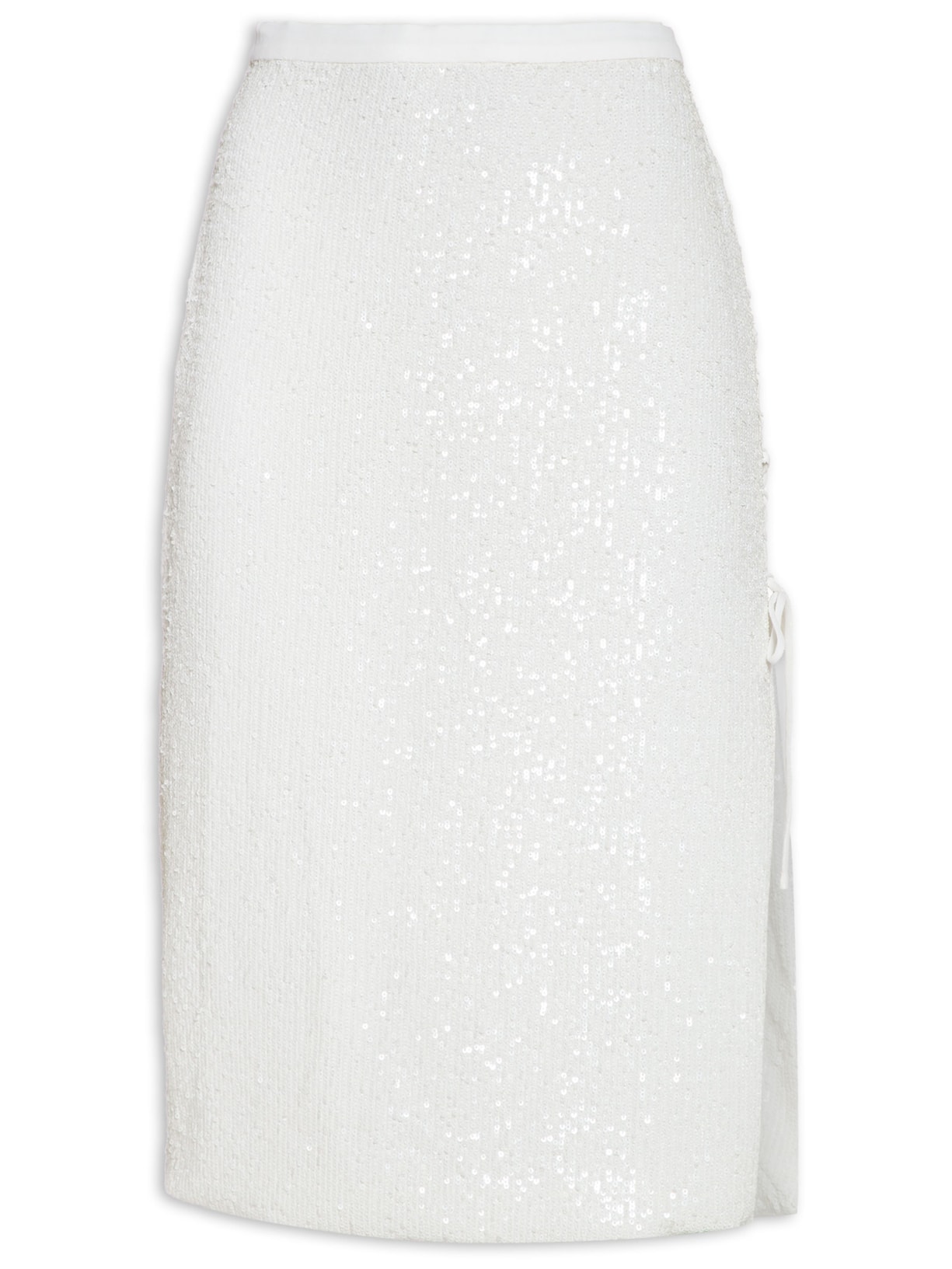 A saia branca é confeccionada em tecido leve com superfície em paetês e baixa elasticidade. A peça solta ao corpo possui cintura alta, pences posteriores, recorte lateral com tira aplicada para amarração, forro, comprimento midi e fechamento lateral por zíper invisível.