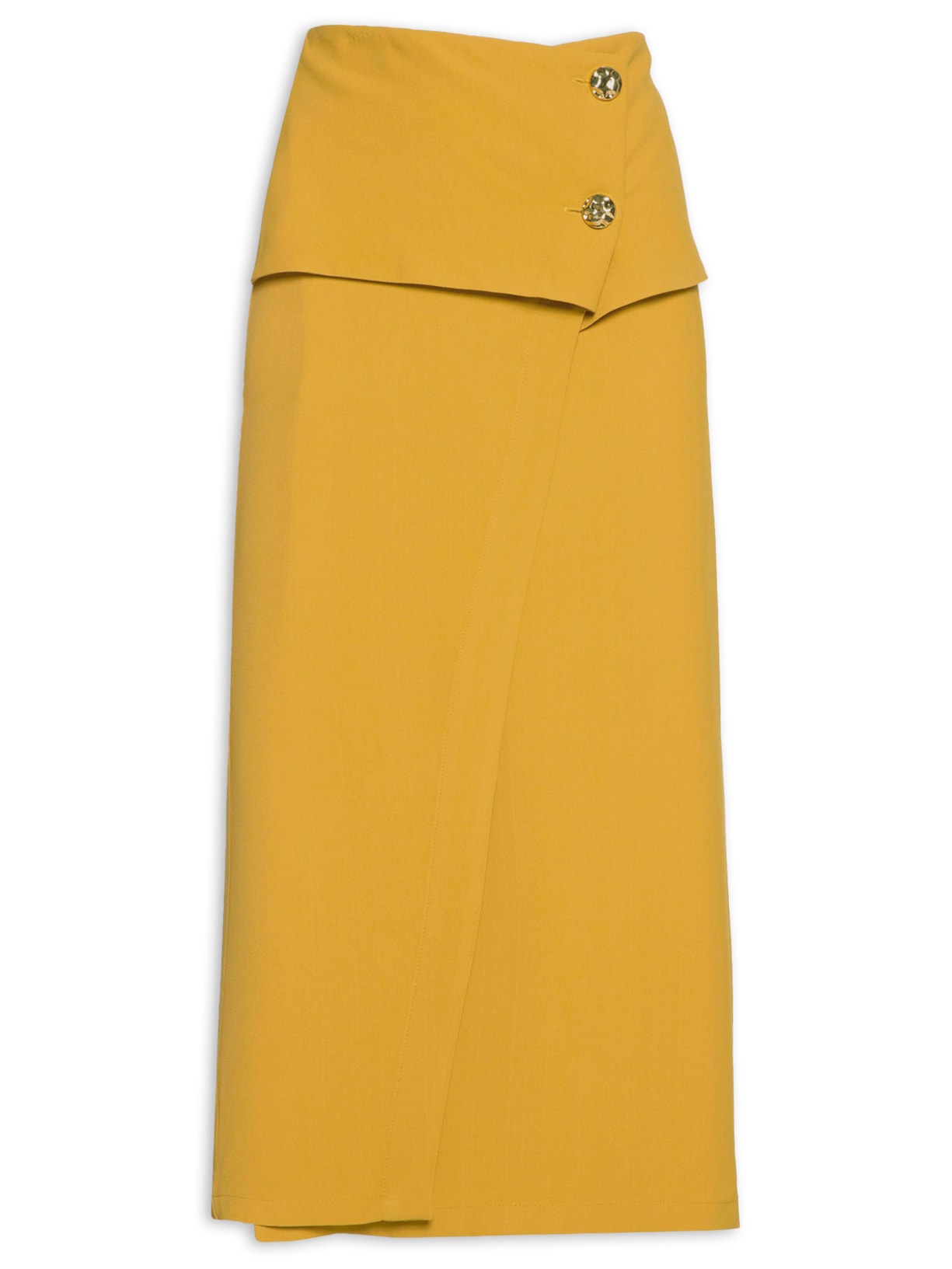 A saia amarela é confeccionada em crepe sem elasticidade. A peça solta ao corpo possui cintura alta, recorte superior sobreposto, recorte frontal sobreposto, fechamento frontal por botões metalizados com efeito martelado e comprimento midi.