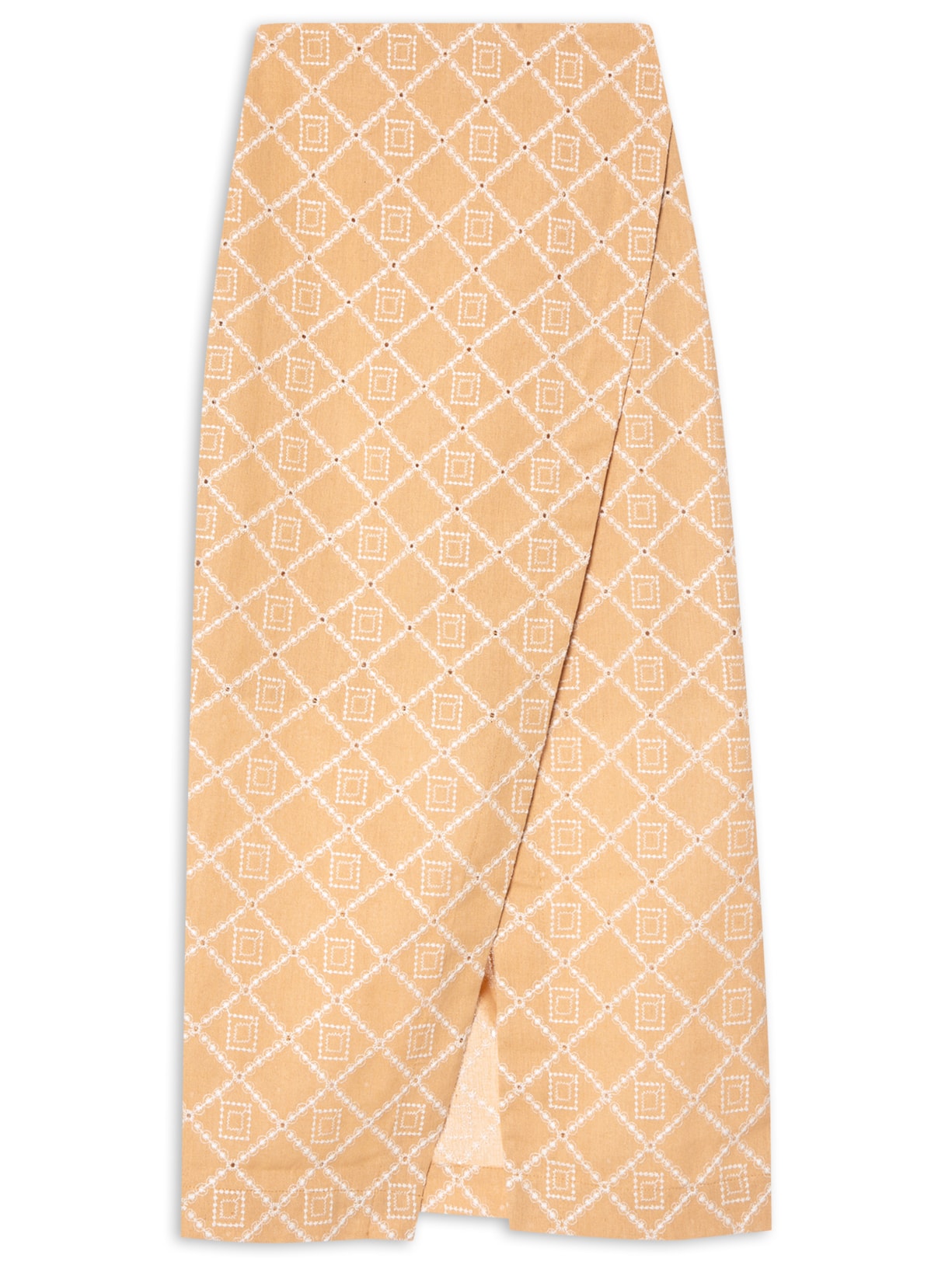 A saia bege é confeccionada em tecido leve com toque de linho sem elasticidade. A peça solta ao corpo possui cintura alta, pences posteriores, meio forro, detalhe de transpasse na parte frontal com assimetria, fenda frontal, bordados geométricos na cor off white, perfuros, comprimento midi e fechamento lateral por zíper invisível.