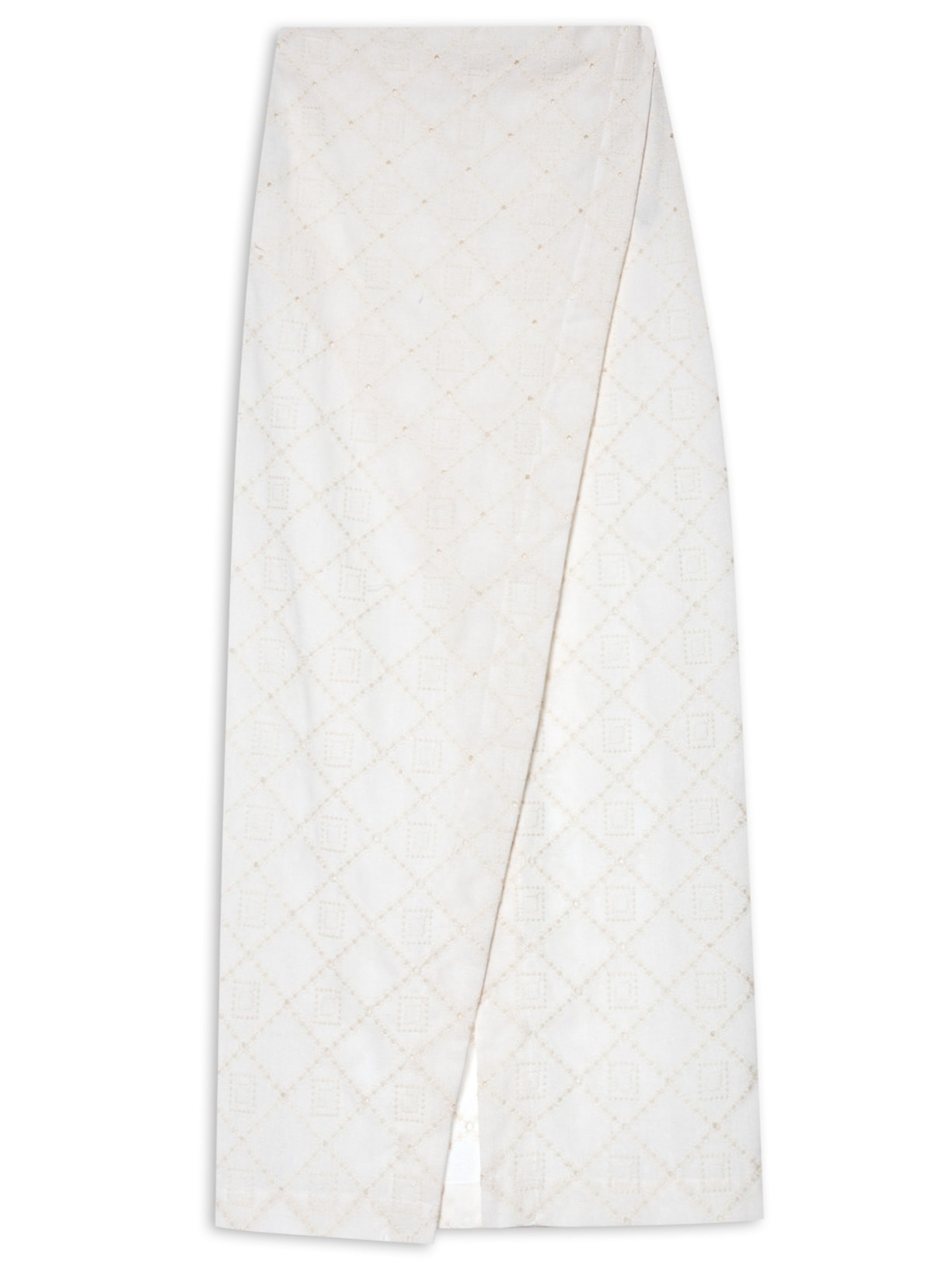 A saia off white é confeccionada em tecido leve com toque de linho sem elasticidade. A peça solta ao corpo possui cintura alta, pences posteriores, meio forro, detalhe de transpasse na parte frontal com assimetria, fenda frontal, bordados geométricos, perfuros, comprimento midi, leve transparência e fechamento lateral por zíper invisível.