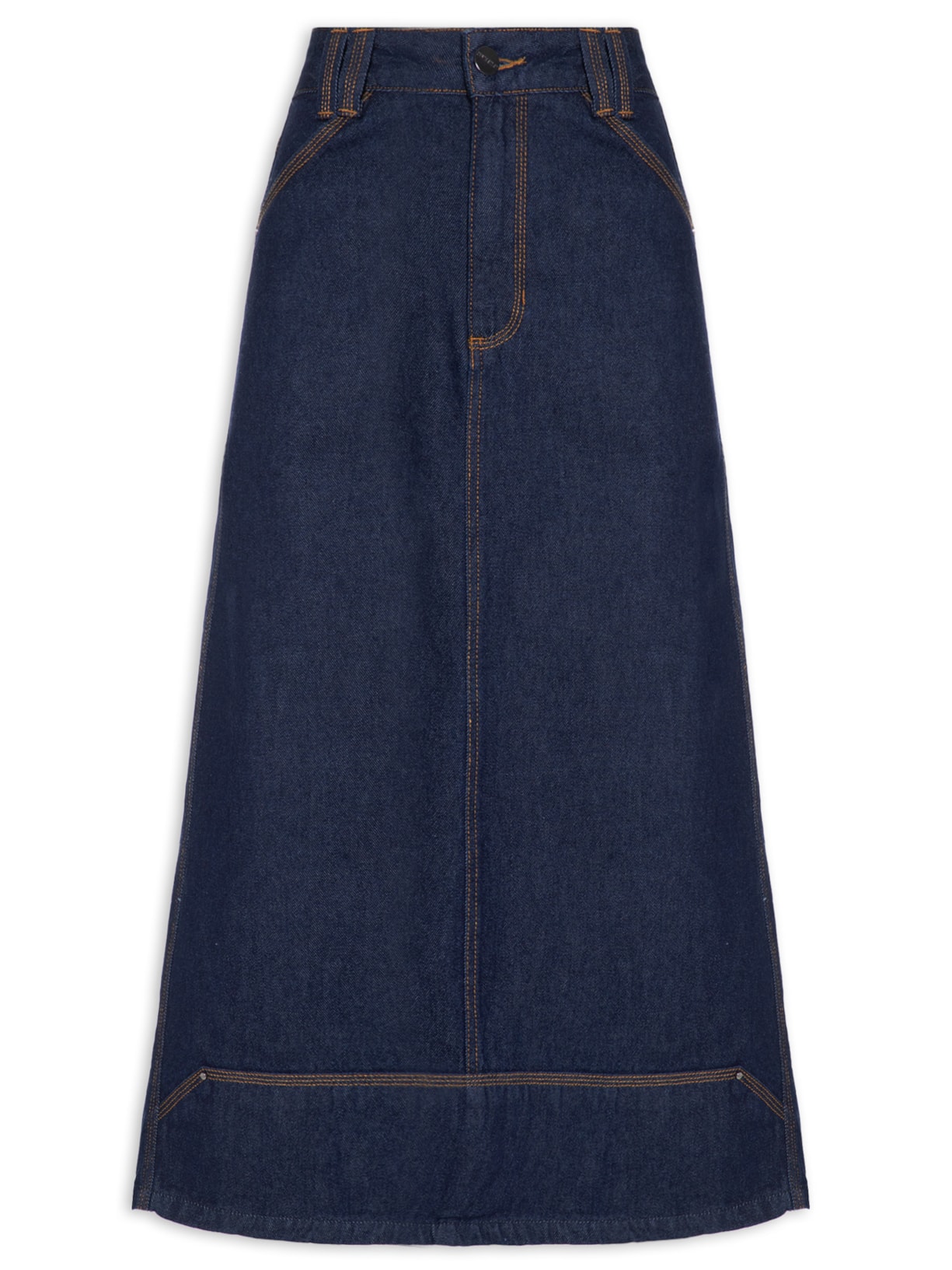 A saia azul é confeccionada por sarja com lavagem jeans sem elasticidade. A peça solta ao corpo possui cintura alta, passantes aplicados no cós, five pockets*, tag da marca metalizada aplicada no bolso posterior, recorte posterior, comprimento midi e fechamento frontal por botões e zíper.