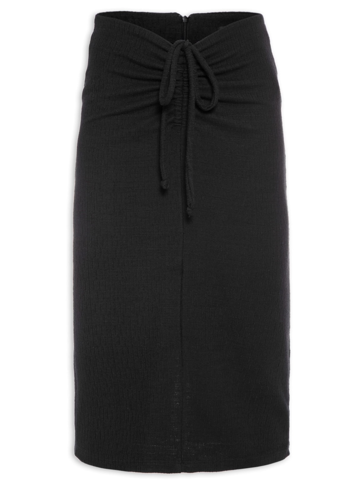 A saia preta é confeccionada em malha com toque de linho. A peça possui cintura alta, recorte frontal com cordão embutido e detalhe de franzido, fenda posterior, comprimento midi, shape solto, caimento reto, acabamento pespontado e fechamento posterior por zíper invisível.