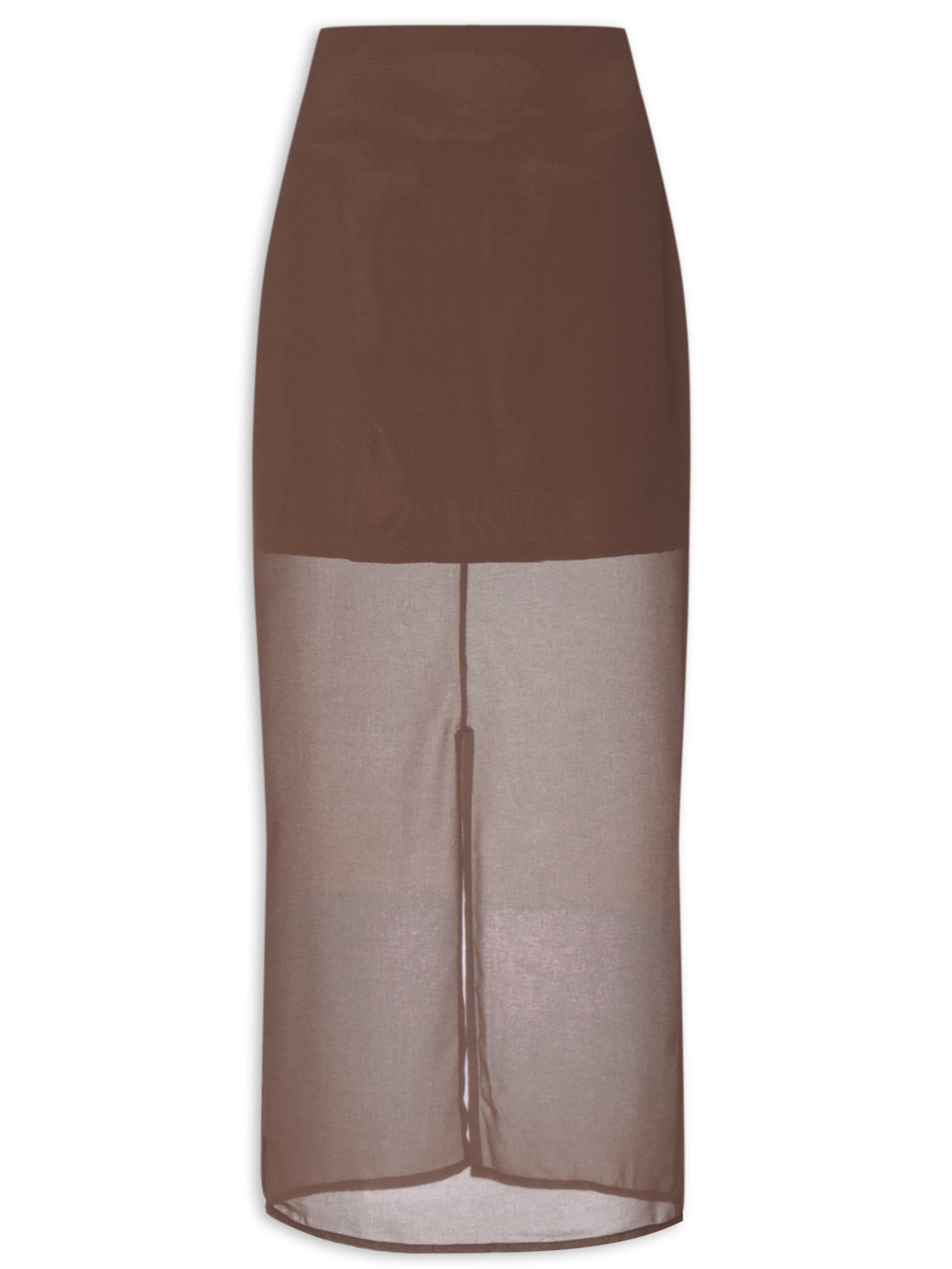 A saia marrom é confeccionada em tule sem elasticidade. A peça justa ao corpo possui cintura alta, meio forro, transparência e comprimento midi.