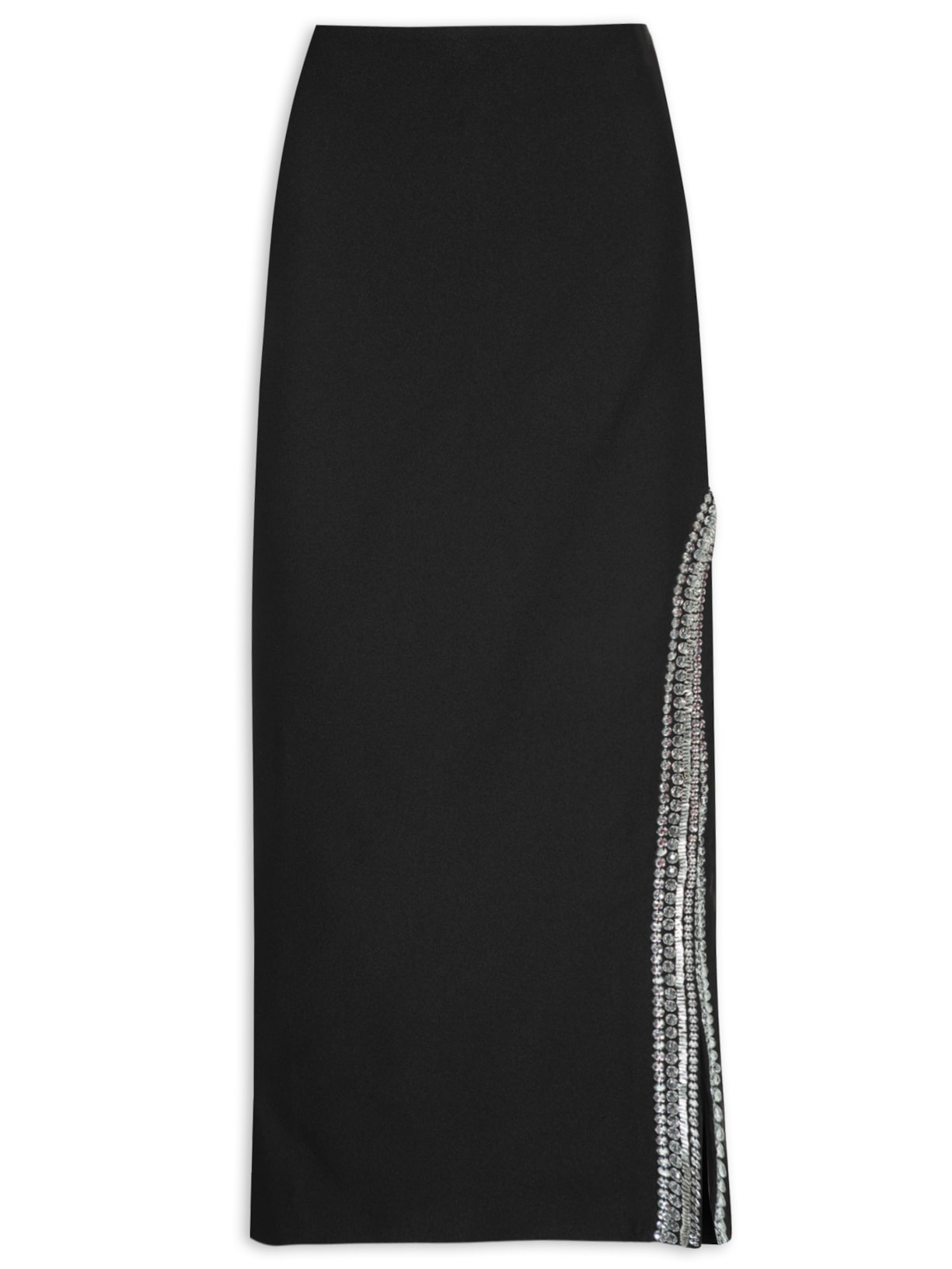 A saia preta é confeccionada em tecido encorpado com superfície texturizada e sem elasticidade. A peça solta ao corpo possui cintura alta, fenda frontal com aplicação de strass e miçangas, pences posteriores, forro, comprimento midi e fechamento posterior por zíper invisível.