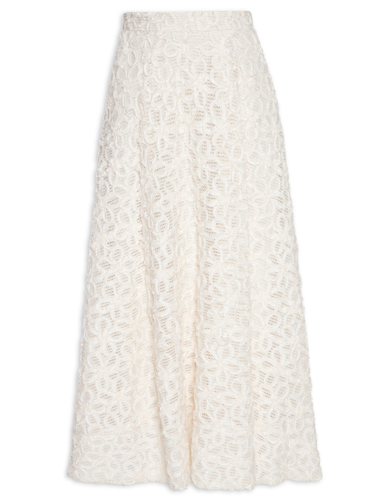 A saia off white é confeccionada em tela sem elasticidade. A peça solta ao corpo possui cintura alta, recorte posterior, pregas frontais, padronagem floral em sobreposições em tecido leve com detalhe de bordas desfiadas, forro, comprimento midi e fechamento posterior por zíper.