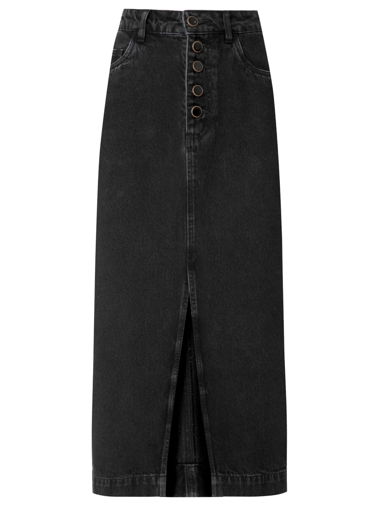 A saia preta é confeccionada por sarja com lavagem em jeans sem elasticidade. A peça solta ao corpo possui cintura alta, passantes aplicados no cós, five pockets*, tag da marca metalizada aplicada no bolso posterior, fenda frontal, fechamento por botões frontais e comprimento midi.