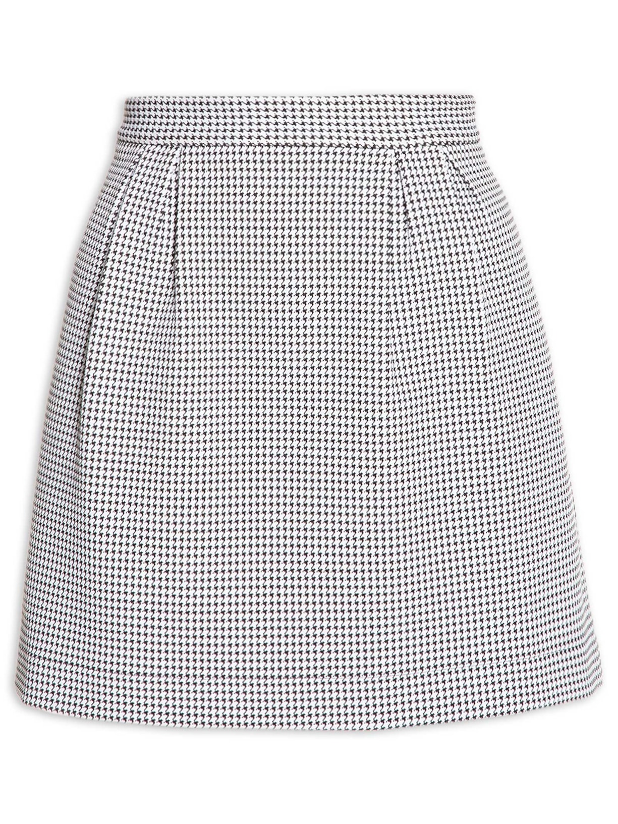 A saia branca é confeccionada em jacquard. A peça possui cintura alta, pregas frontais, bolsos frontais embutidos, pences posteriores, forro, comprimento curto, padronagem de pied poule em cor contrastante, shape solto e fechamento posterior por zíper metalizado.