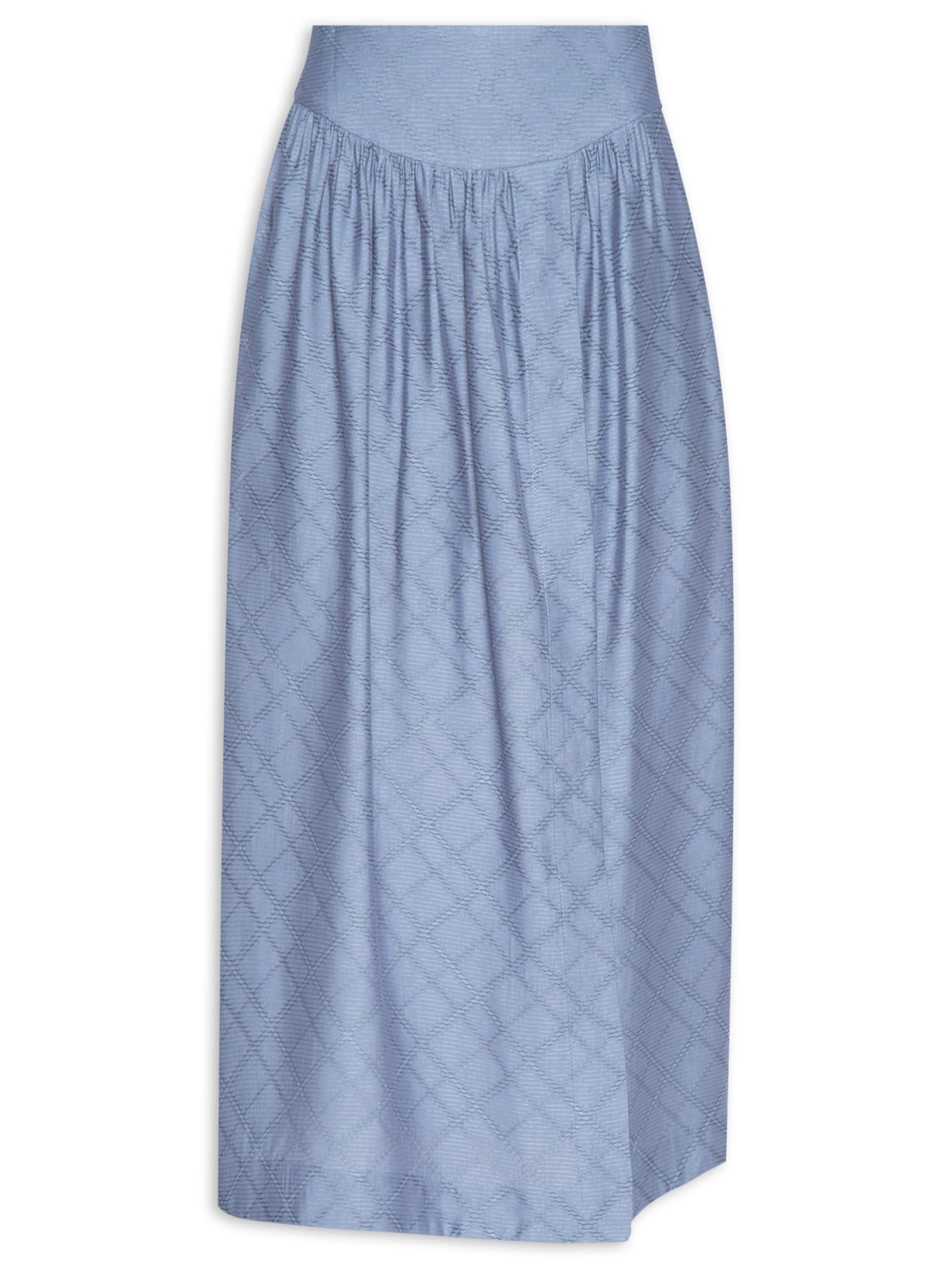 A saia azul é confeccionada em tecido leve com superfície texturizada e sem elasticidade. A peça solta ao corpo possui cintura alta, cós estendido com recorte frontal assimétrico com franzido, fenda frontal, forro em short, comprimento midi e fechamento lateral por zíper invisível.
