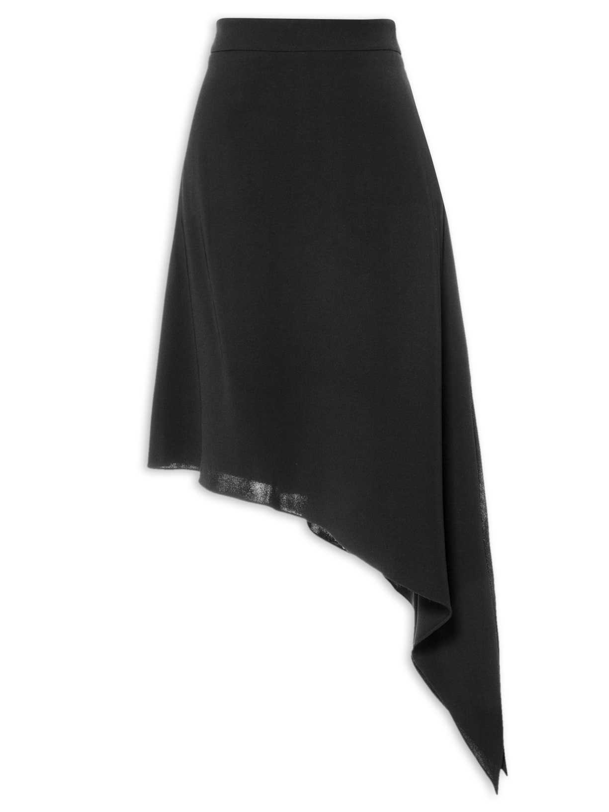 A saia preta é confeccionada em crepe. A peça possui cintura alta, barra assimétrica com fenda lateral, comprimento midi, shape solto, caimento reto, acabamento pespontado e fechamento lateral por zíper metálico e botão interno.