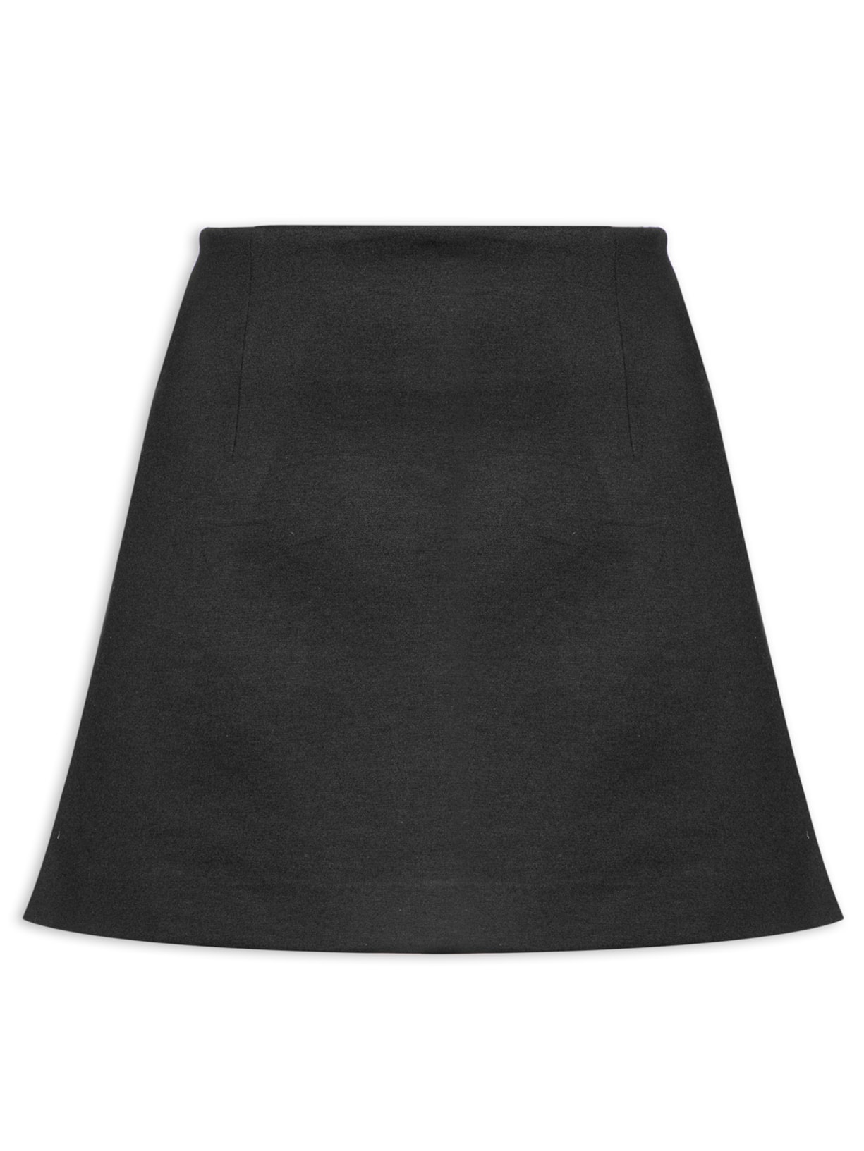 A saia preta é confeccionada em malha encorpada de baixa elasticidade. A peça solta ao corpo, possui cintura alta, bolsos faca frontais, fendas laterais, comprimento curto, forro e fechamento posterior por zíper invisível.