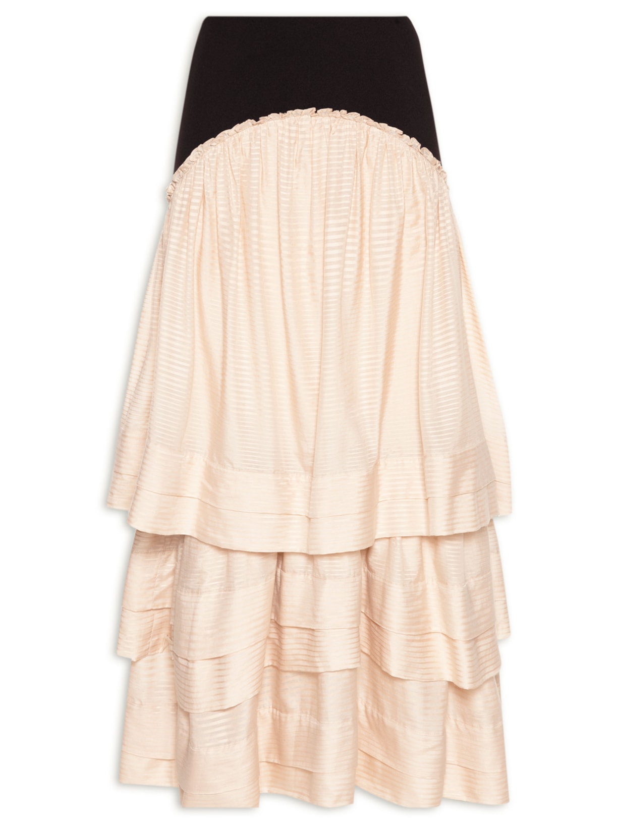 A blusa bege é confeccionada em tecido leve com toque de seda sem elasticidade. A peça solta ao corpo possui cintura alta, recorte superior em malha preta com média elasticidade, detalhe de babados sobrepostos, recorte posterior, padronagem listrada em tom contrastante, comprimento longo e fechamento posterior por zíper invisível.