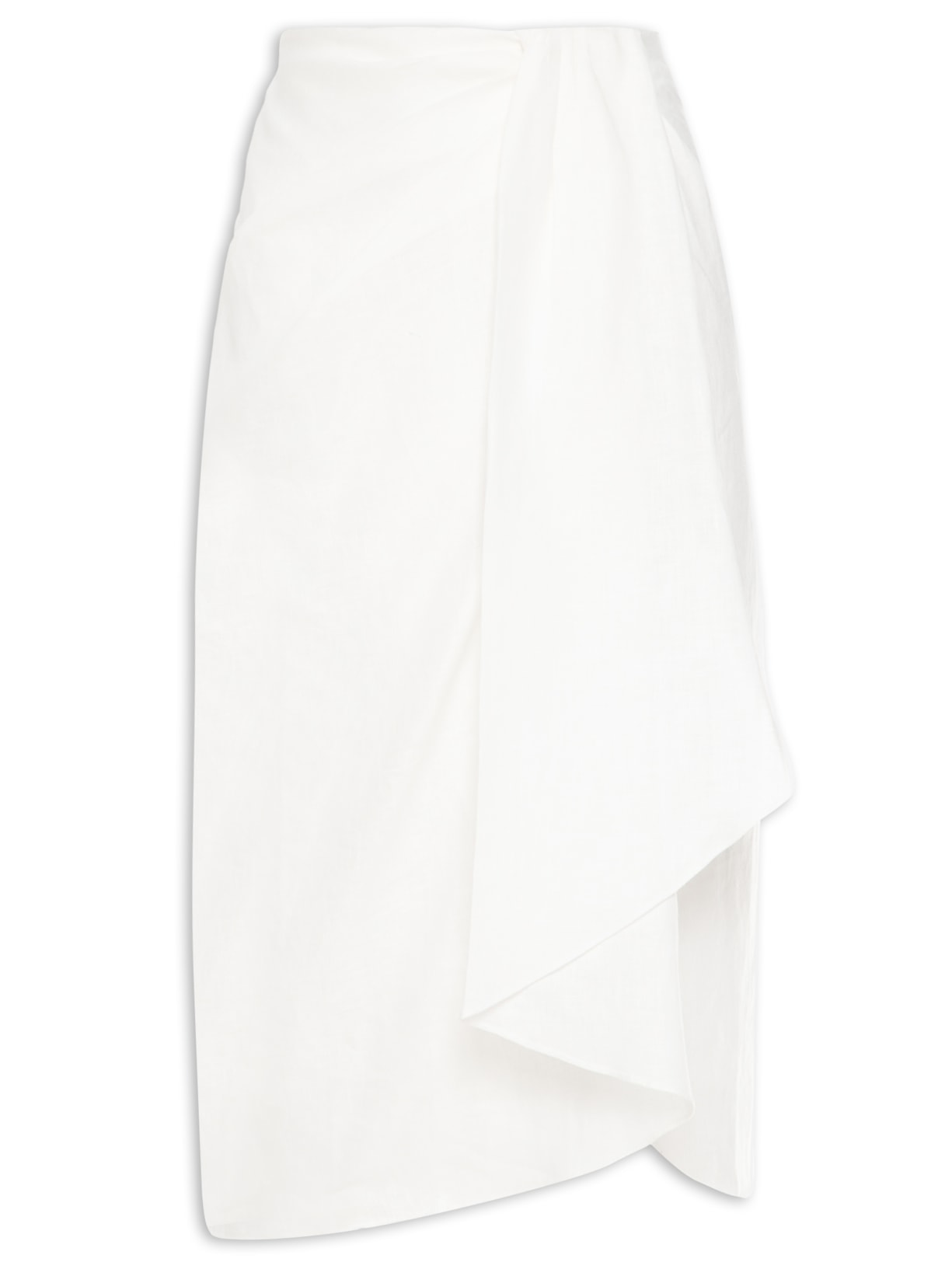 A saia off white é confeccionada em linho. A saia possui cintura alta, recorte frontal sobreposto com detalhes de drapeados, barra com parte frontal assimétrica, pences posteriores, forro, shape solto e fechamento posterior por zíper invisível.