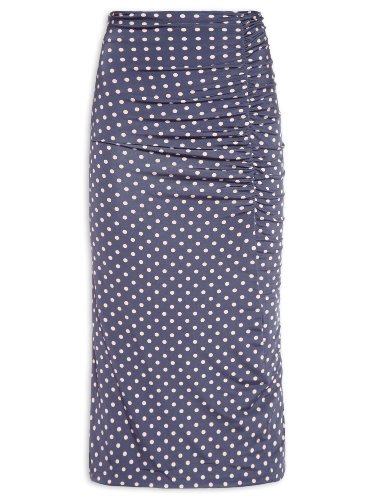 A saia azul é confeccionada em malha leve. A peça possui cintura alta, recorte frontal com detalhe de franzido, forro, fenda posterior, padronagem poá em cor contrastante, comprimento midi, shape justo, caimento reto, acabamento pespontado e fechamento lateral por zíper invisível.