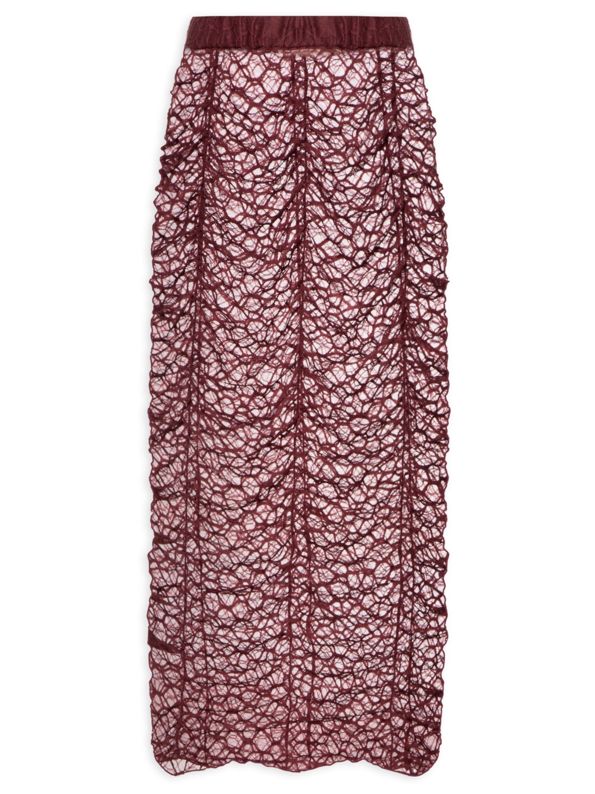 A saia vinho é confeccionada em renda de média elasticidade. A peça solta ao corpo possui cintura alta, cós com elástico embutido, recortes com franzido, padronagem abstrata, transparência, sem forro, acabamento overlocado e comprimento midi.