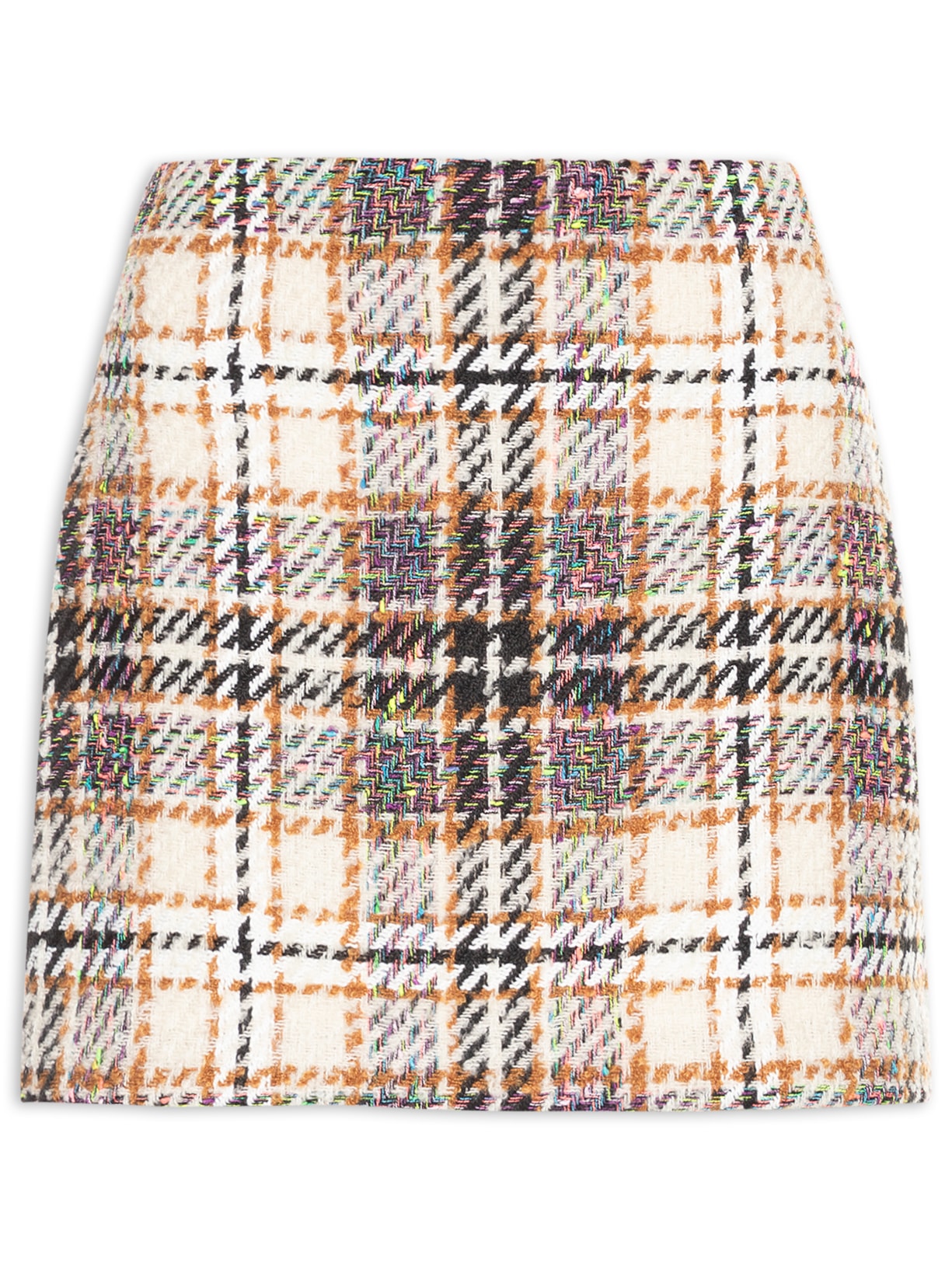 O tradicional tweed aparece nesta temporada com modelagens super atuais sem deixar o conforto de lado. Aposte nesta saia Le Lis combinada com uma blusa branca, casaco de tweed sobreposto como conjunto, brincos metalizados e uma bota de cano alto!