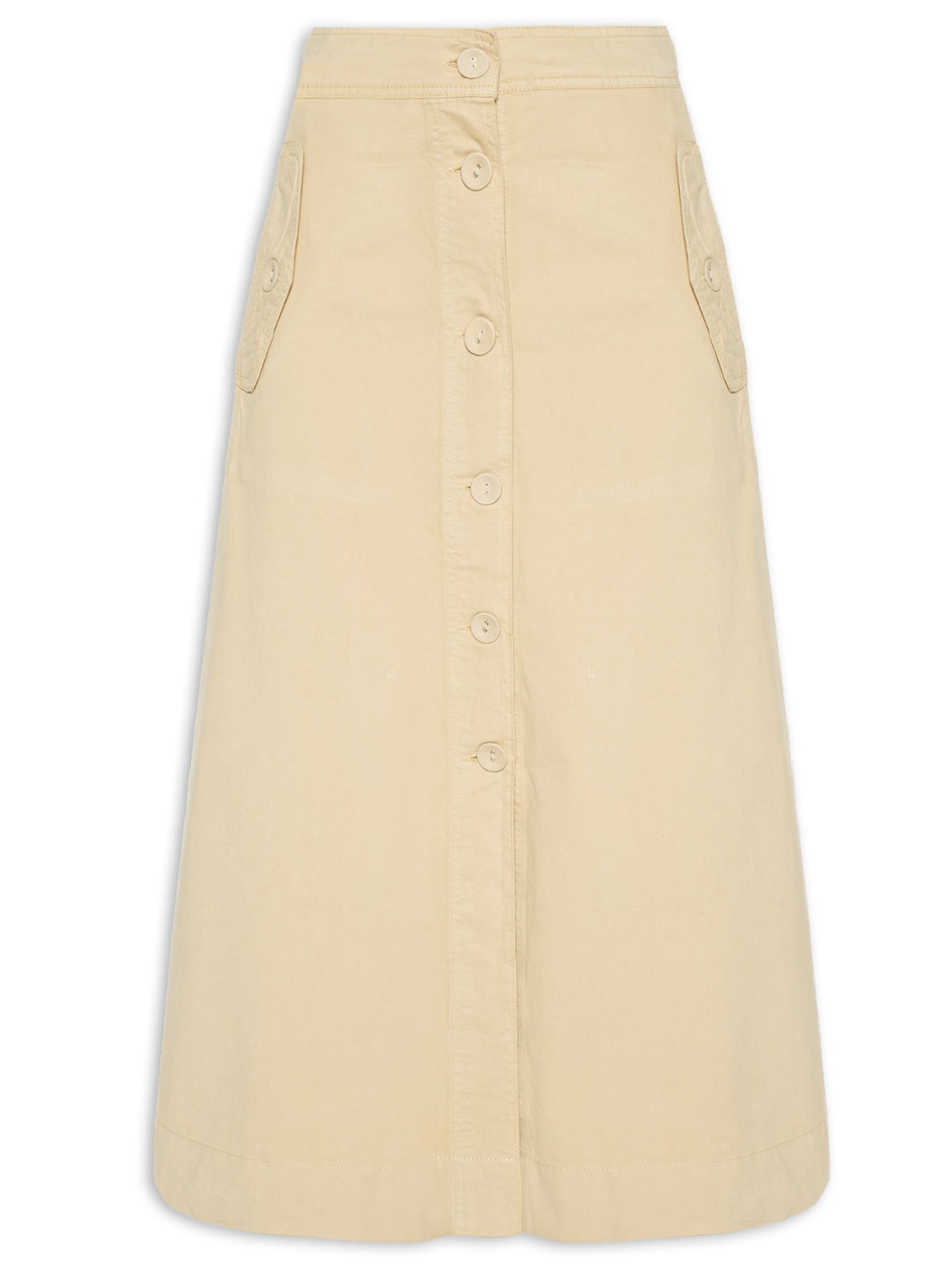 A saia bege é confeccionada em sarja sem elasticidade. A peça solta ao corpo possui cintura alta, cós com passante posterior, recorte posterior, bolsos frontais com vista sobreposta com botão, fenda frontal, comprimento midi e fechamento frontal por botões.