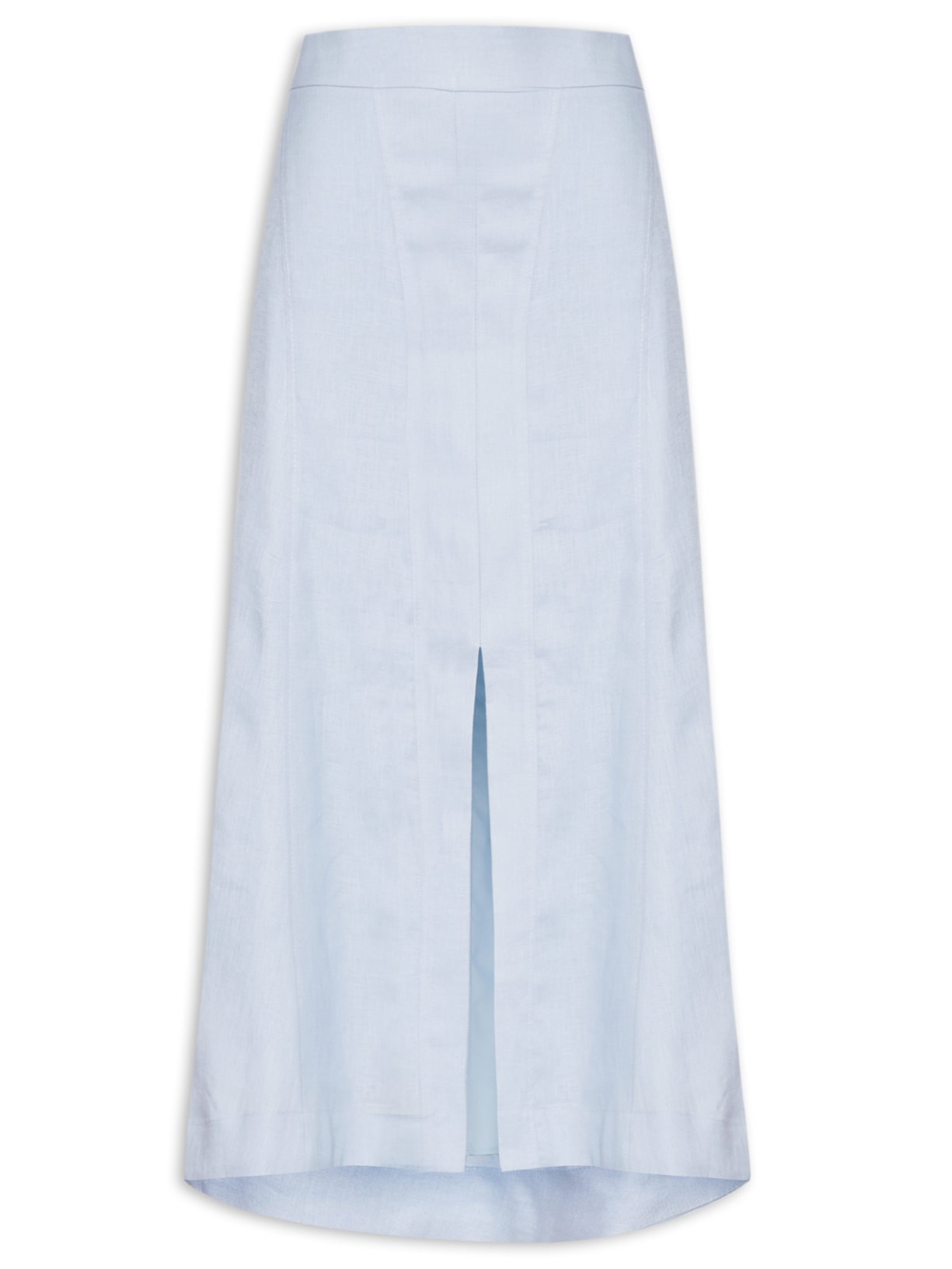 A saia azul é confeccionada em linho sem elasticidade. A peça solta ao corpo possui cintura alta, cós com elástico embutido na parte posterior, recortes frontais e posteriores, fenda frontal, tag metálica da marca aplicada na parte posterior, forro, comprimento midi e fechamento posterior por zíper invisível.