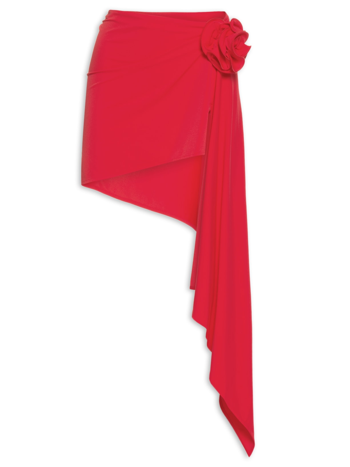 A saia vermelha é confeccionada em malha com alta elasticidade. A peça justa ao corpo possui cintura alta, cós com elástico embutido, recorte frontal com fenda, sobreposição frontal com formato figurativo de flor e efeito drapeado, comprimento alongado na parte lateral, assimetria, barra mullet* e comprimento curto.