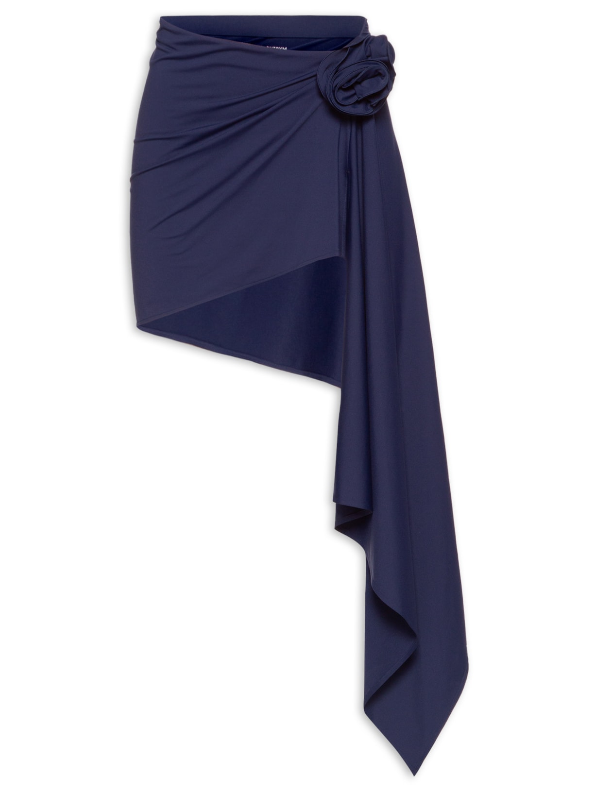A saia azul marinho é confeccionada em malha de poliamida com alta elasticidade. A peça possui cintura baixa, cós com elástico embutido, aplicação frontal figurativa de maxi flor, fenda frontal, barra assimétrica com recorte frontal assimétrico alongado e comprimento curto.