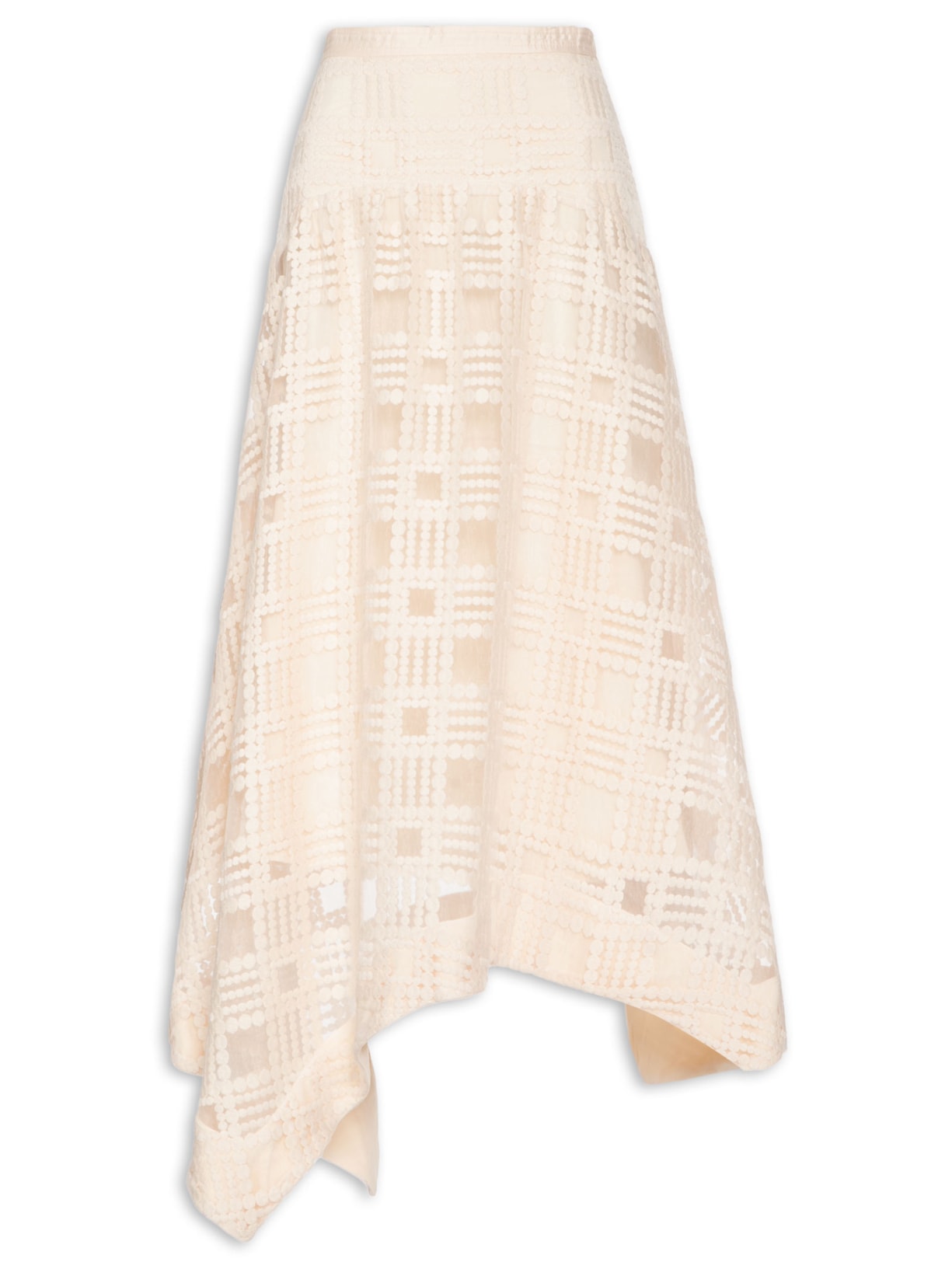 A saia bege é confeccionada em tecido leve transparente e sem elasticidade. A peça solta ao corpo possui cintura alta, recortes frontais e posteriores, detalhe bordados circulares por toda a peça, forro, barra asimétrica, comprimento midi e fechamento latreral por zíper invisível.