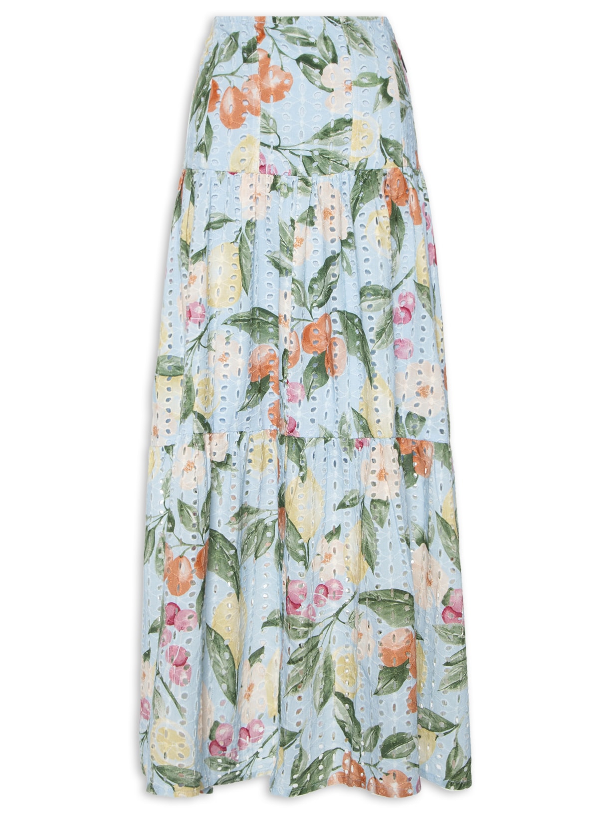 A saia azul é confeccionada em laise sem elasticidade. A peça solta ao corpo possui cintura alta, recortes posteriores e frontais com detalhe de franzidos, meio forro, estampa floral em cores contrastantes, fenda frontal, comprimento midi e fechamento lateral por zíper.