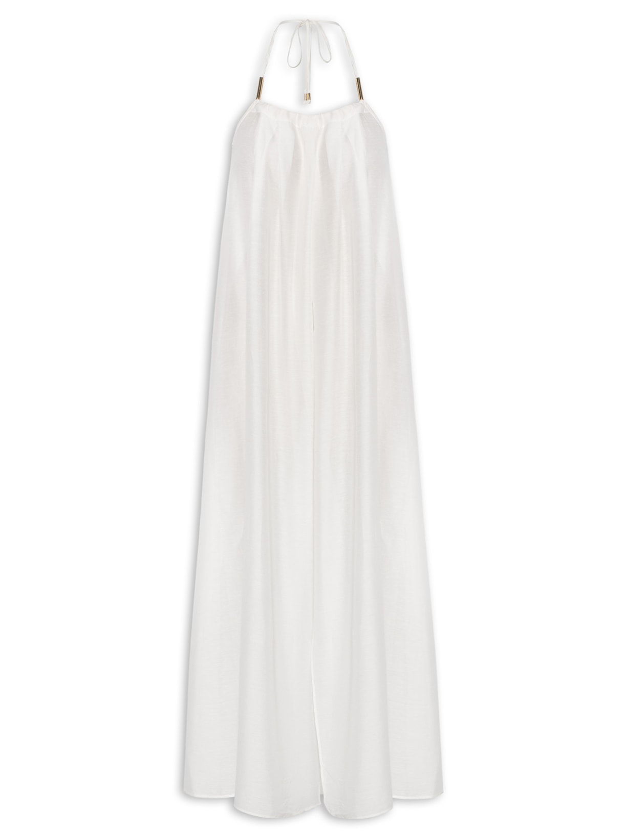 A saída de praia branca é confeccionada em tecido leve com toque de linho e seda sem elasticidade. A peça solta ao corpo possui decote U, alças finas alongadas para amarração posterior com canutilho metálico, fenda frontal, elástico embutido na parte posterior, transparência, sem forro e comprimento midi.