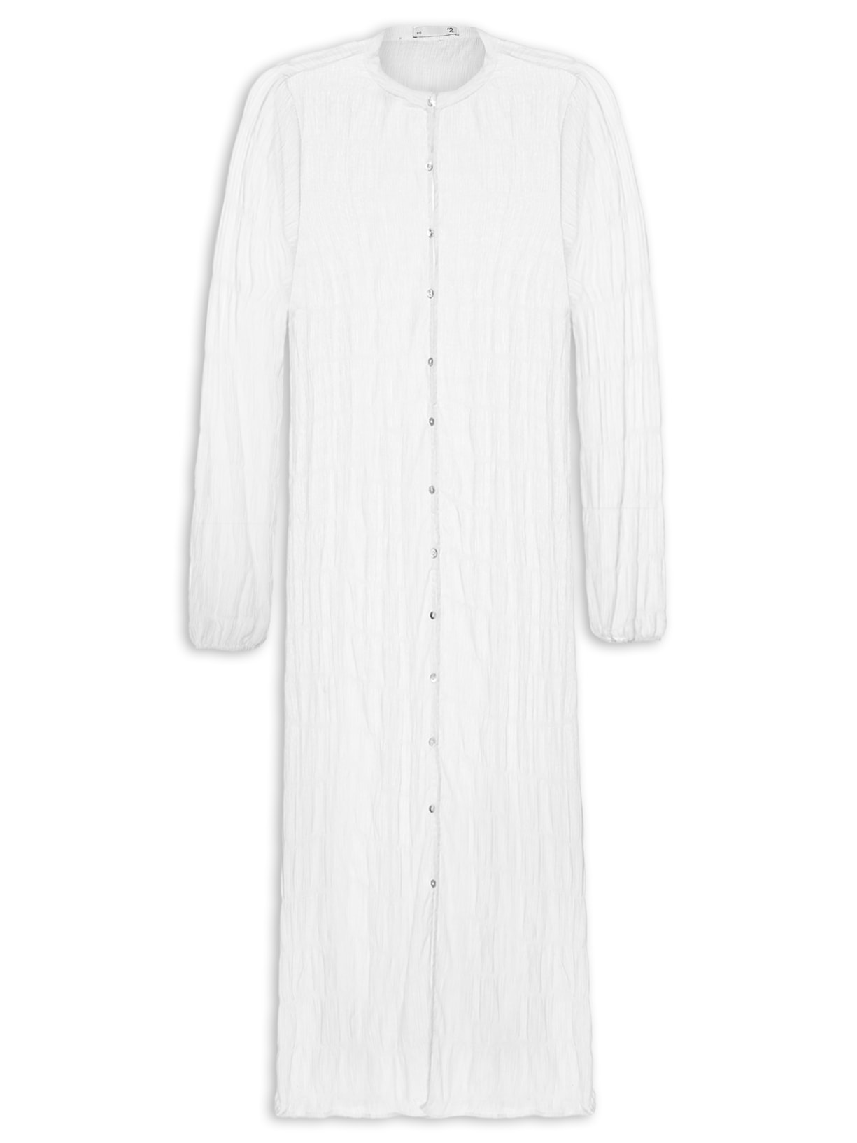 A saída de praia branca é confeccionada em tecido leve com superfície texturizada e baixa elasticidade. A peça solta ao corpo possui decote arredondado, mangas longas com elástico embutido nos punhos, comprimento longo, transparência e fechamento frontal por botões.