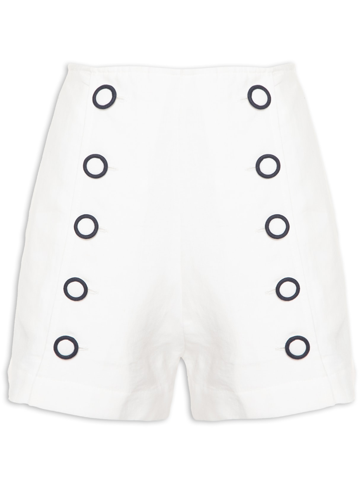 O short branco é confeccionado em tecido leve. A peça possui cintura alta, bolsos frontais embutidos, recortes frontais com botões decorativos forrados em cor contrastante, shape solto, caimento reto, forro, acabamento pespontado e fechamento lateral por zíper invisível.