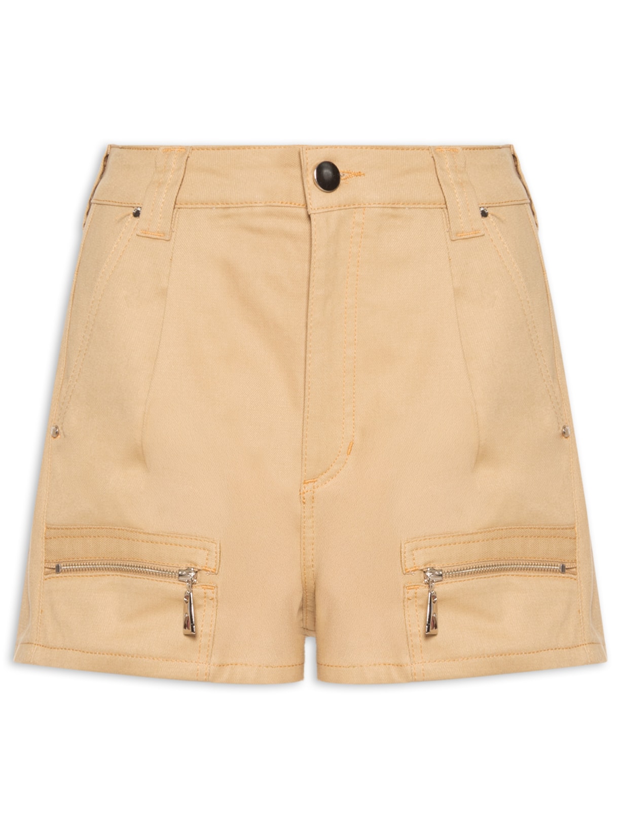 O short bege é confeccionado em sarja sem elasticidade. A peça solta ao corpo possui cintura alta, cós com passantes, recortes posteriores, bolsos posteriores, bolsos frontais modelo faca, pregas frontais, bolsos frontais com fechamento por zíper e fechamento frontal por botão e zíper.