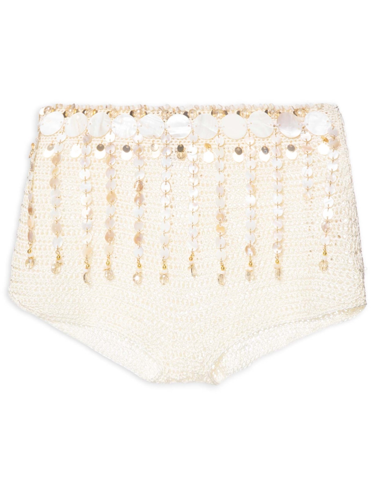 O short off white é confeccionado em crochet manual com média elasticidade. A peça justa ao corpo de modelo hotpant*, possui cintura alta, cós com bordado em medalhas douradas em latão, madrepérolas naturais e metal, transparência, comprimento curto e fechamento lateral por zíper invisível.