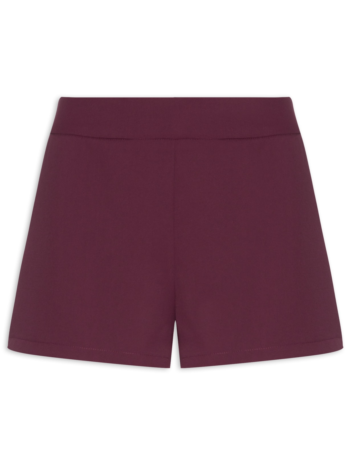 O short vinho e confeccionado em tecido leve sem elasticidade. A peça solta ao corpo possui cintura alta, bolso posterior decorativo, comprimento curto e fechamento lateral por zíper.