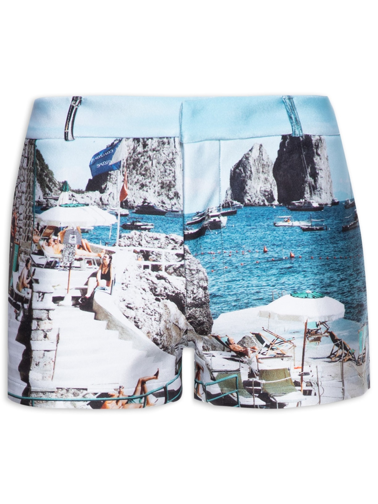 O short azul é confeccionado em malha de poliamida com média elasticidade. A peça justa ao corpo possui cintura média, cós com passantes aplicados, bolsos frontais de modelo faca, bolsos posteriores decorativos, estampa figurativa de cores contrastantes, comprimento curto e fechamento frontal em zíper e colchetes.