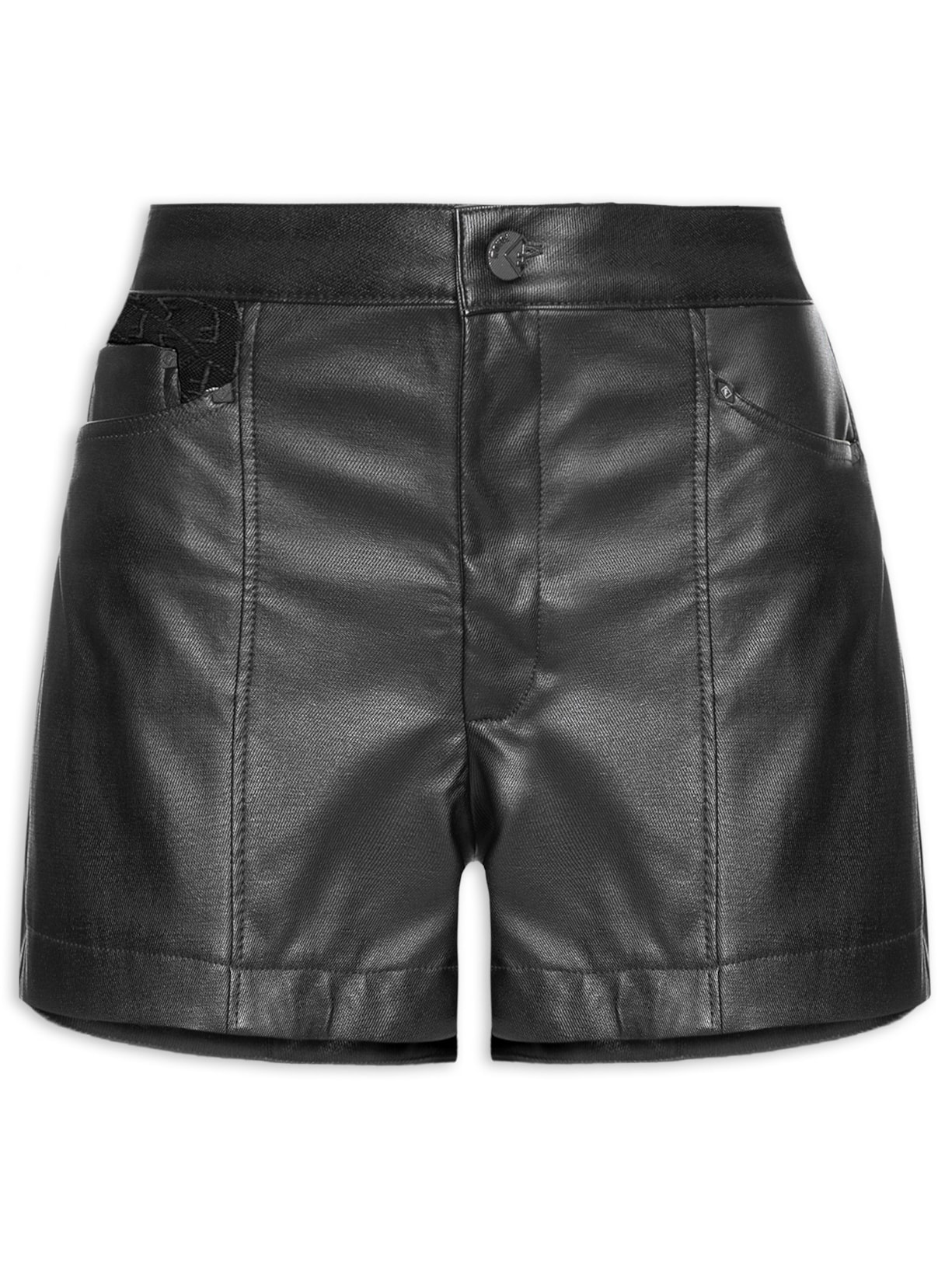 O short preto é confeccionado em material sintético sem elasticidade. A peça solta ao corpo possui cintura alta, bolsos frontais com detalhe de recorte em tule com padronagem de logomania da marca, nervuras frontais, pences posteriores, comprimento curto e fechamento frontal por zíper e botão.