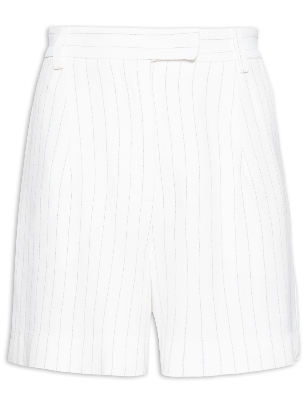 O short branco é confeccionado em crepe patou sem elasticidade. A peça solta ao corpo possui cintura média, passantes aplicados no cós, pregas frontais, padronagem listrada em cor contrastante, elástico embutido no cós posterior, fechamento por zíper e colchete frontal e comprimento curto.