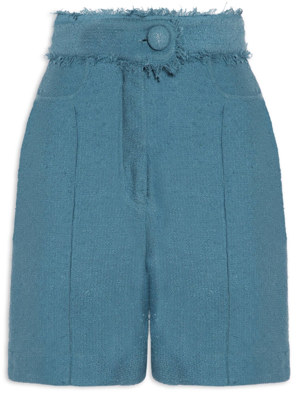 O short azul é confeccionado em tecido encorpado. A peça possui cintura alta, cós com detalhes de desfiados, bolsos frontais e posteriores, recortes frontais com detalhes de vivos, shape solto, caimento reto, acabamento pespontado e fechamento frontal por botão forrado e zíper.