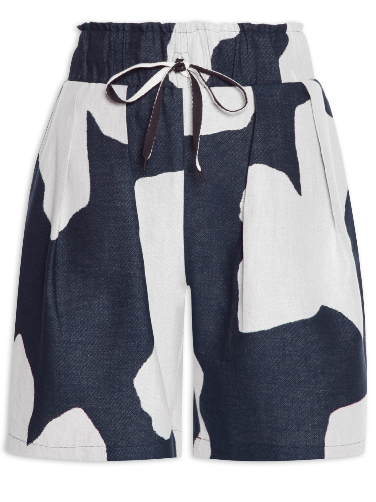 O short azul é confeccionado em tecido leve sem elasticidade. A peça solta ao corpo, possui cintura alta, cós largo com elástico embutido e cordão para amarração frontal, bolsos faca frontais, pregas frontais, recorte posterior e padronagem abstrata em cor contrastante.