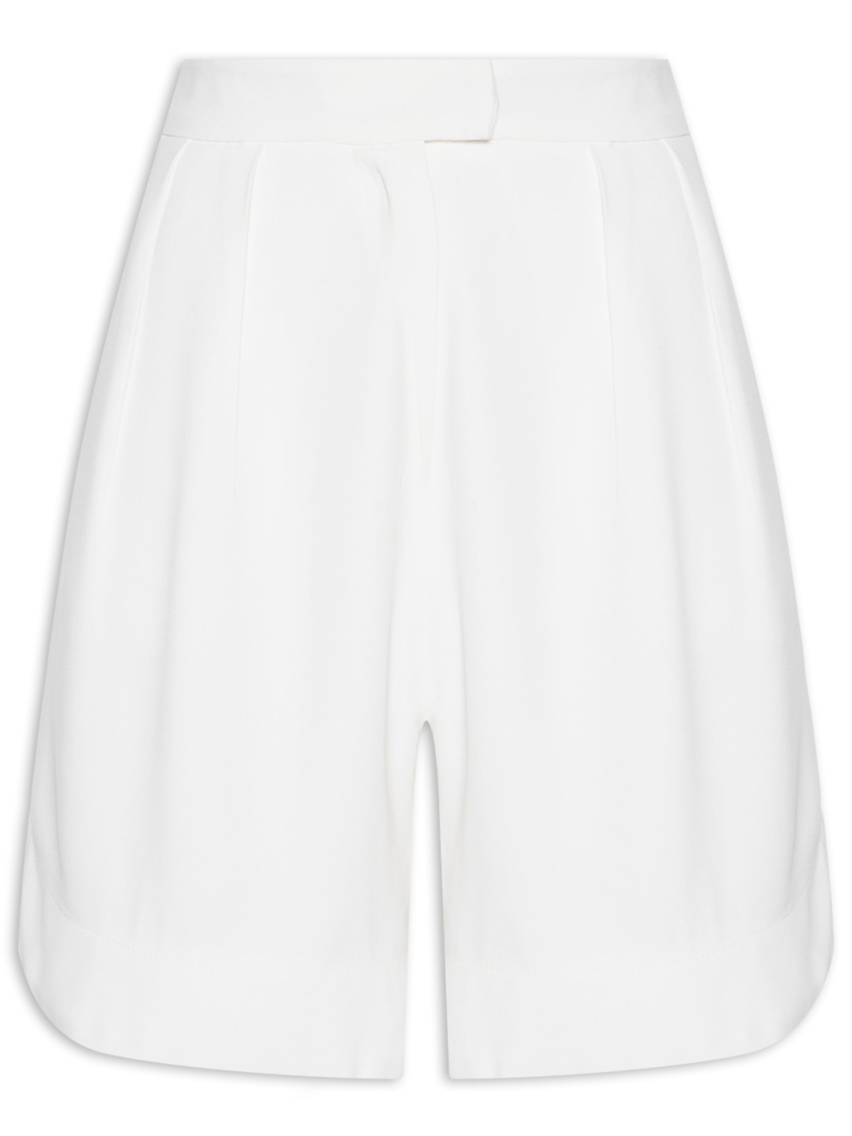 O short branco é confeccionado em tecido leve sem elasticidade. A peça solta ao corpo possui cintura alta, pences posteriores e pregas frontais na altura do cós, bolsos posteriores decorativos, bolsos frontais modelo faca e fechamento frontal por botão, colchete e zíper.