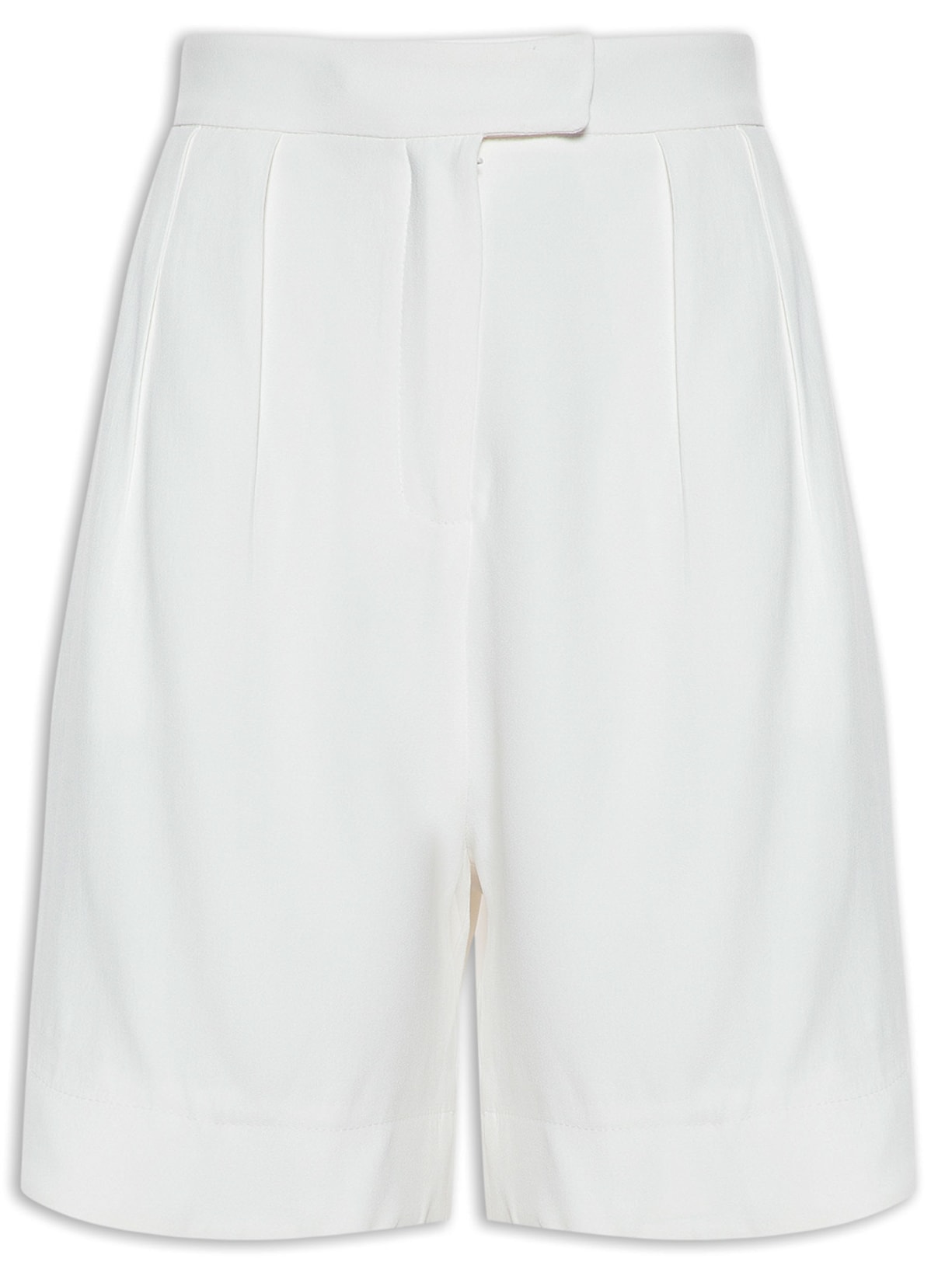 O short off white é confeccionado em tecido leve sem elasticidade. A peça solta ao corpo possui cintura alta, pences posteriores, bolsos posteriores decorativos, bolsos frontais modelo faca, pregas na parte frontal, barras arredondadas e fechamento frontal por botão, colchete e zíper.