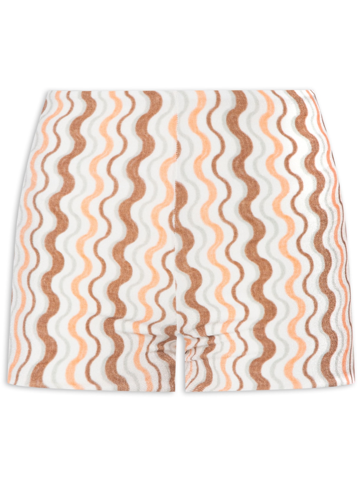 O short bege é confeccionado em tecido atoalhado com alta elasticidade. A peça justa ao corpo possui cintura alta, cós com elástico embutido, estampa abstrata em cores contrastantes e forro.