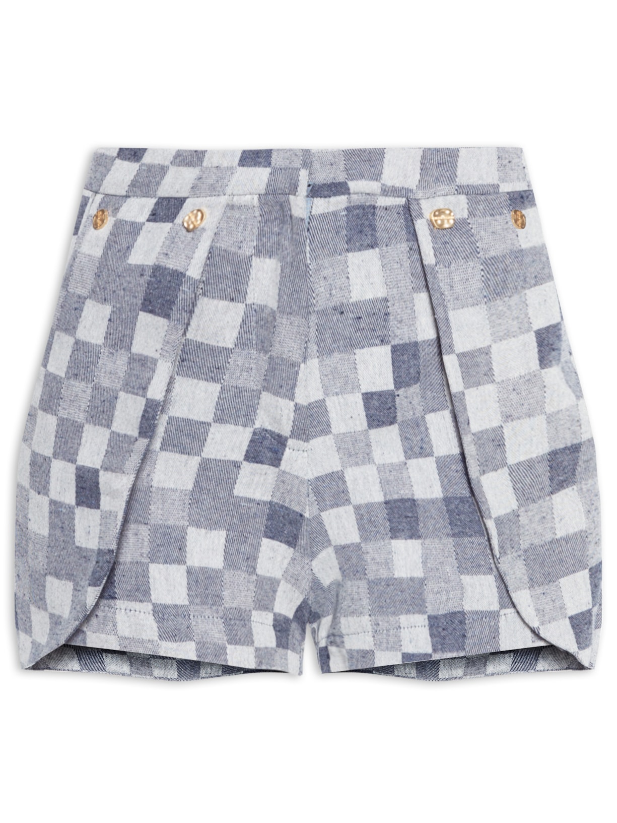 O short azul é confeccionado em sarja sem elasticidade. A peça solta ao corpo, possui cintura alta, cós com elástico embutido na parte posterior, bolsos faca frontais, recortes frontais arredondados com sobreposição e aplicações metálicas com superfície irregular, padronagem quadriculada em tons contrastantes e fechamento frontal por zíper e colchete.