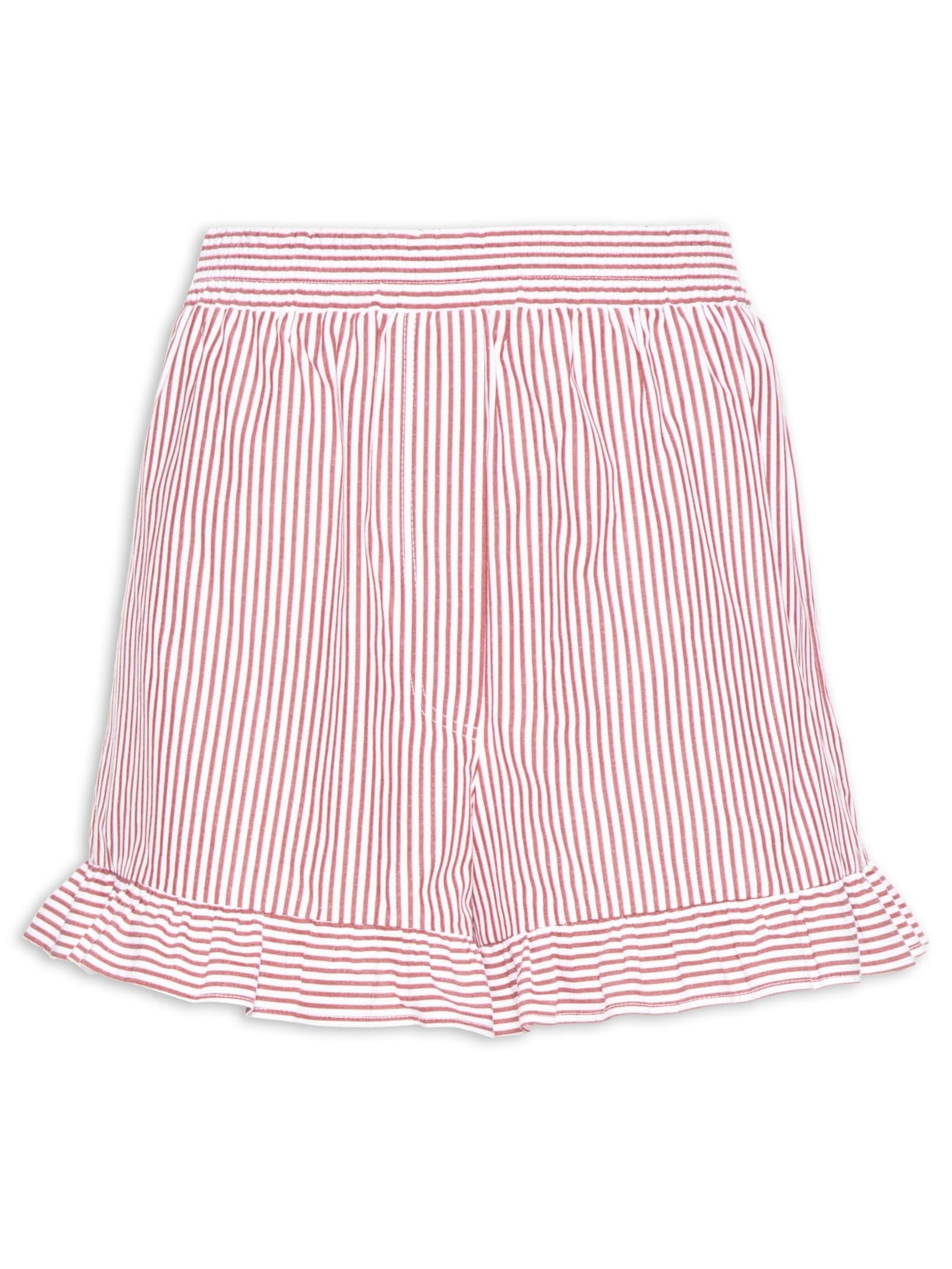 O short vermelho é confeccionada por tricoline sem elasticidade. A peça solta ao corpo possui cintura média, elástico embutido no cós, barra com acabamento em babados, padronagem listrada em cor contrastante e comprimento curto.