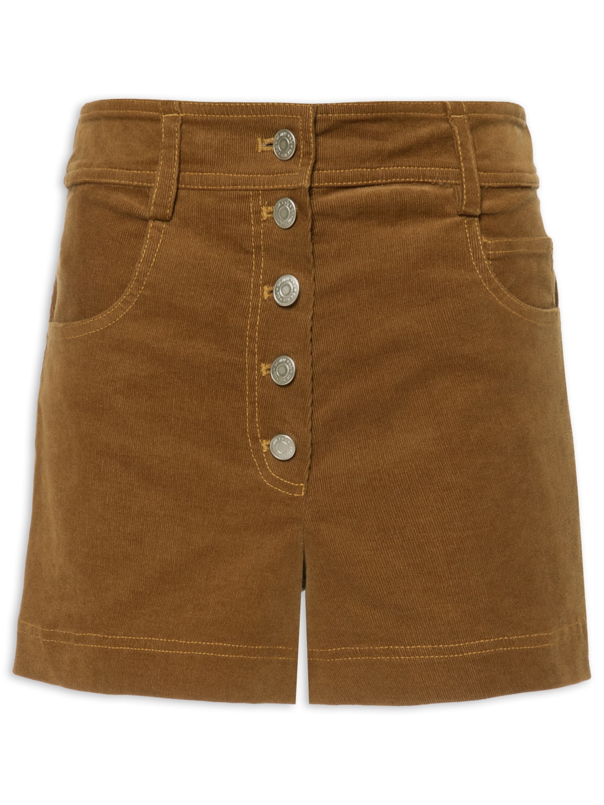 O short marrom é confeccionado em veludo cotelê com média elasticidade. A peça solta ao corpo possui cintura alta, passantes aplicados no cós, five pockets*, tendo os bolsos posteriores fechamento por botão, recorte em V no cós posterior, fendas laterais, comprimento curto e fechamento frontal por botões.