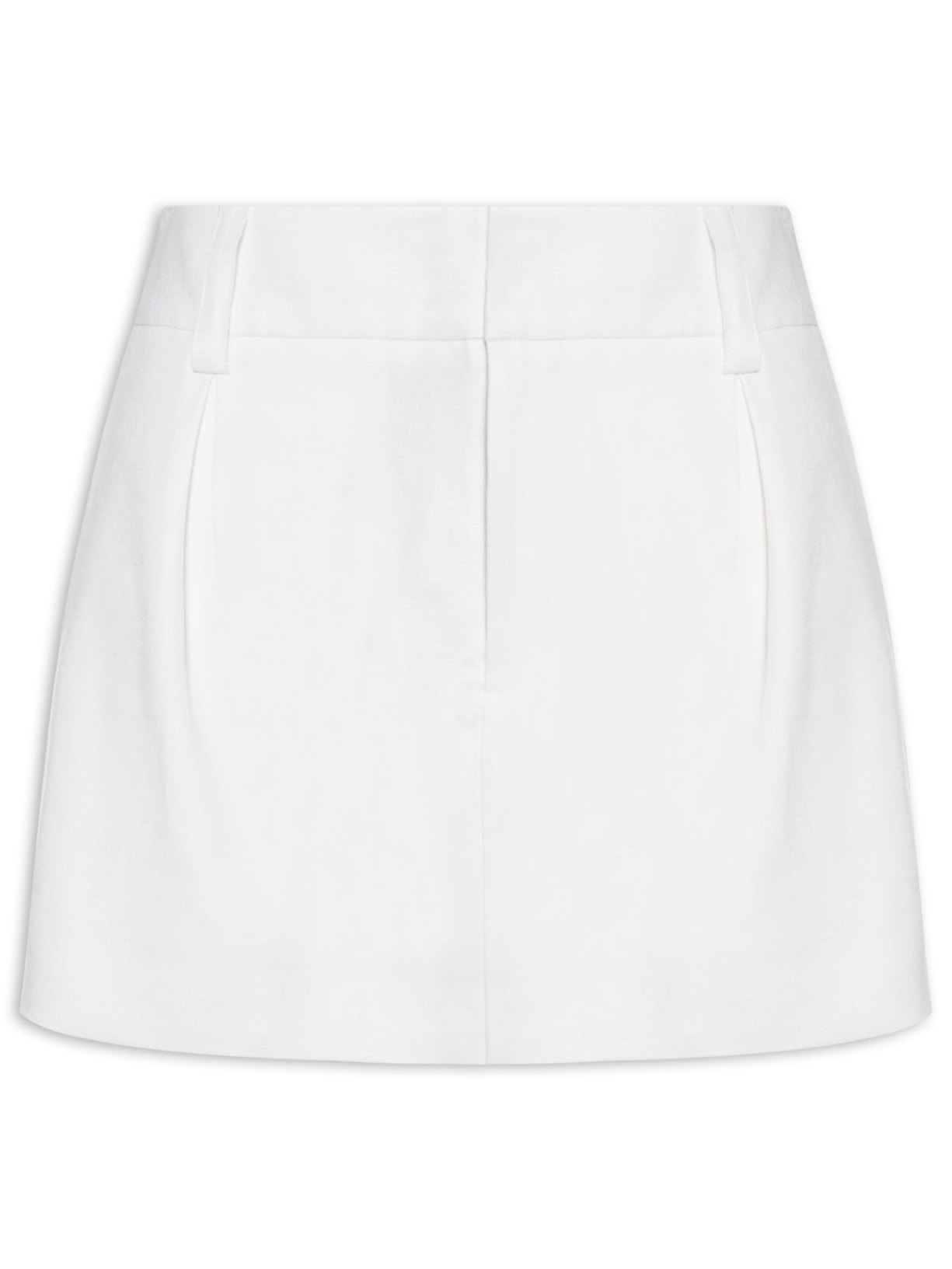 O short saia branco é confeccionado em linho sem elasticidade. A peça solta ao corpo possui cintura alta, cós com passantes e aplicação de martingale nas laterais e parte posterior, pregas frontais, bolsos frontais de modelo faca, bolsos posteriores, comprimento curto e fechamento frontal por zíper e colchetes.