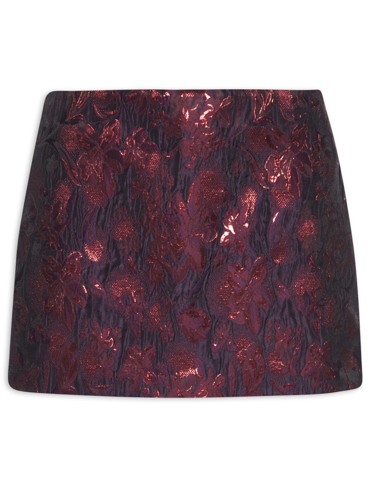 O short saia vermelho é confeccionado em jacquard com fios metalizados sem elasticidade. A peça solta ao corpo possui cintura alta, pences posteriores, logo da marca aplicado em metal na parte posterior, padronagem floral em cor contrastante, comprimento curto, forro e fechamento posterior por zíper.