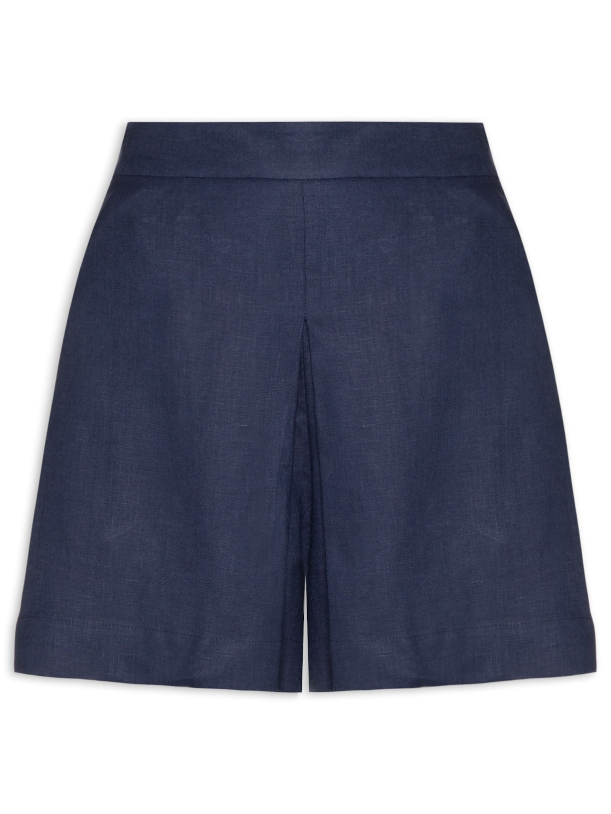 O short saia azul é confeccionado em linho sem elasticidade. A peça solta ao corpo, possui cintura alta, pregas frontais e posteriores, bolsos frontais embutidos, comprimento curto e fechamento lateral por zíper invisível.