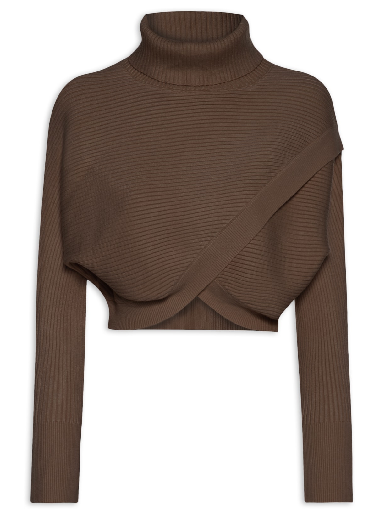 O suéter marrom é confeccionado em tricot com superfície texturizada e alta elasticidade. A peça solta ao corpo possui gola alta, mangas longas com ajuste nos punhos, transpasse na parte frontal com assimetria e barra mullet*.