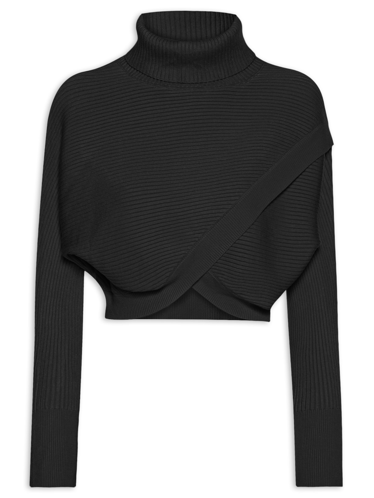O suéter preto é confeccionado em tricot com superfície texturizada e alta elasticidade. A peça solta ao corpo possui gola alta, mangas longas com ajuste nos punhos, transpasse na parte frontal com assimetria e barra mullet*.